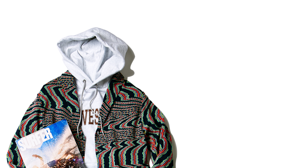 ラグジュアリーストリートのカテゴリーを確立した先駆者〈マルセロ ブロン〉。この総柄ニットも素材が持つ品のよさはそのままに、幾何学柄のような、風景にも見える唯一無二の存在感を放っている。1枚着るだけで街中で人目を引けるのはもちろん、インナーから巧みに柄を差せるアイテムだ。