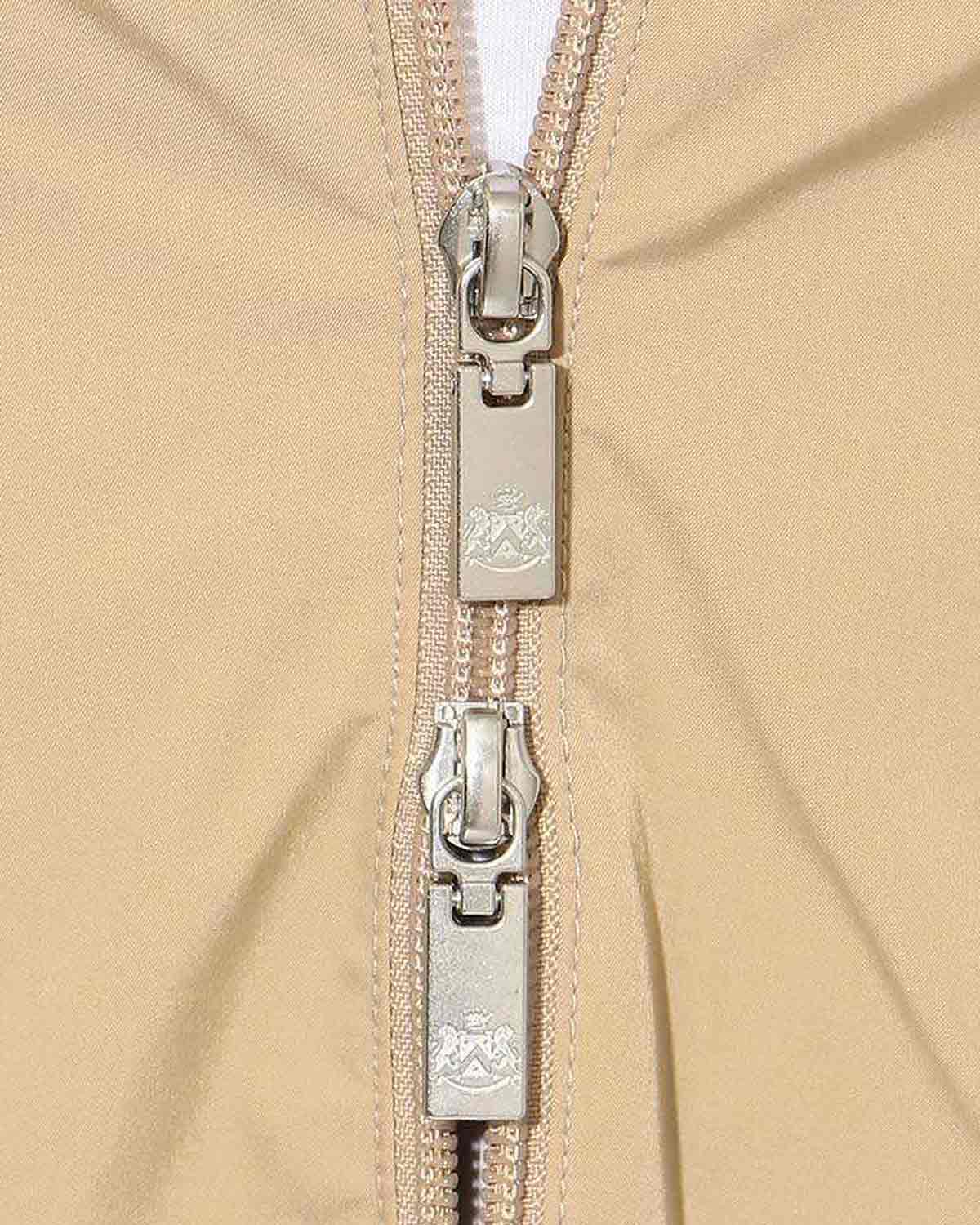 春先にぴったりなナイロンブルゾンはロング丈の作りでエレガントな面構え。裏地はもちろん、脇下にベンチレーション(=通気孔)を完備しているので、蒸れることなく快適に過ごすことができる。ツヤのある生地で高級感もバッチリ。