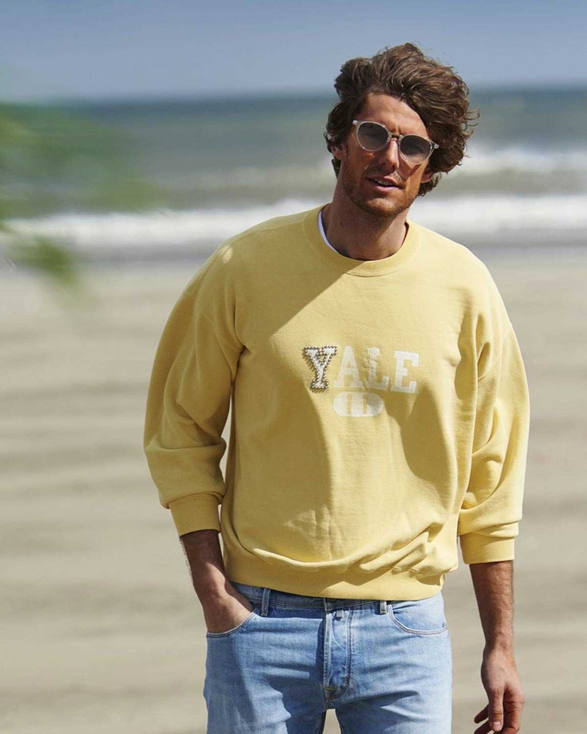 “シーブルー”なんで、やはりビーチでは映えます! デニムとも相性がいいですし、ピンクなんかの派手色パンツなんかと合わせても◎です!