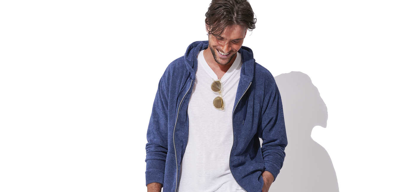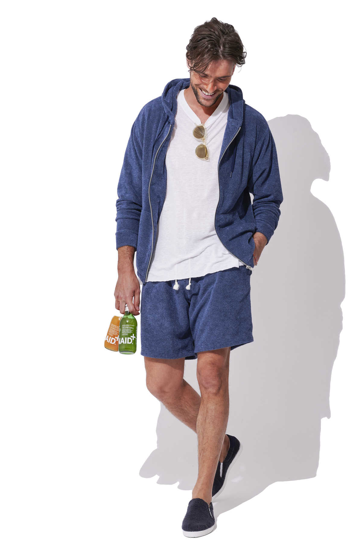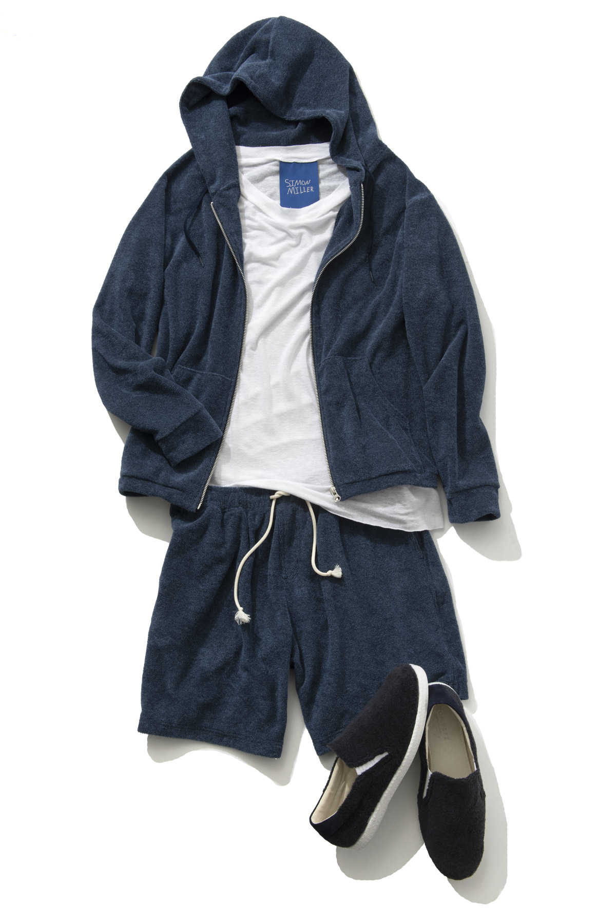素材感で勝負したシンプルなセットアップ。パイル地に使われているコットンは、後日紹介するポロと同様、トルコ共和国のイズミール地方で採れる長綿。一般的な米綿や新疆綿に比べて繊維が長いため、しなやかで心地のよい肌触りが実現できる。高級感のある深いブルーは、さらっと着るだけでリラックスウエアでありながらもリュクスな雰囲気に。