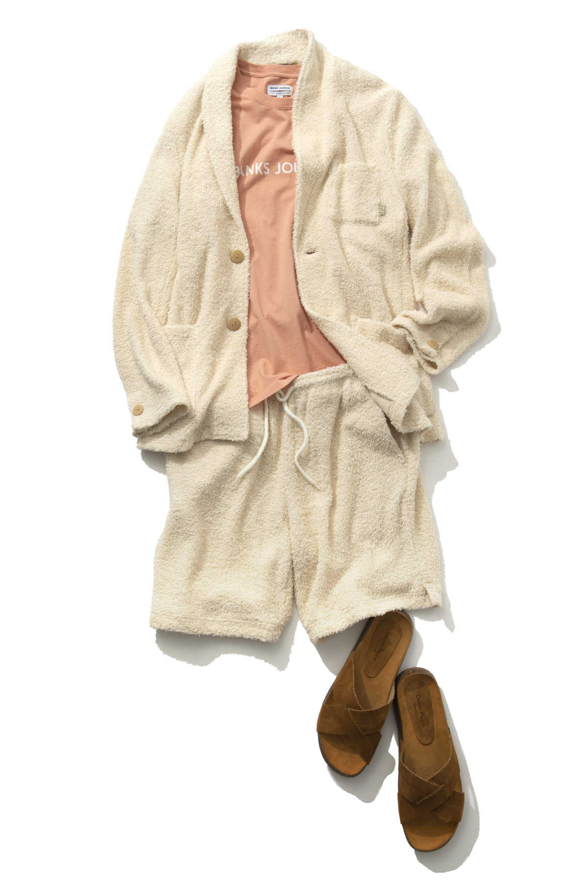 トレンドに流されないシンプルなデザインで、サーファーやセレブにもファンが多い〈アーモンド〉。ラッセル機を使って編まれたパイル地はループが長く、ざっくり&ふんわりとした風合いが特徴。ニットならではの優しい伸縮は着心地がよく、まさしくストレスフリー。柔らかな印象を生むオフホワイトの色みが大人の余裕を演出してくれる。