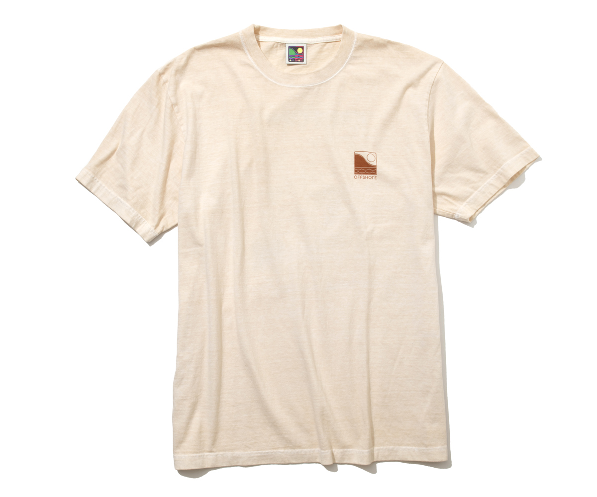 顔料を使って染めるピグメント加工を施すことでユーズド感たっぷりに仕上げられた、『Safari Lounge』の別注Tシャツ。背面にはカリフォルニアのサーフポイントを描いたイラストをプリント。胸元のブランドロゴもありげないアクセントになっている。まるで日焼けしたような、ニュアンスあふれる表情で、こなれ感たっぷりなスタイルを作れる。