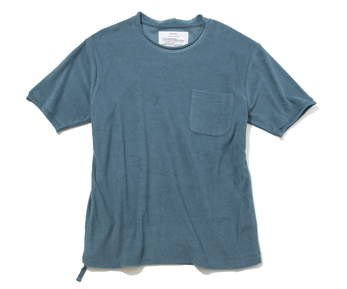 80番手超長綿を使い、しっとりとした肌触りを実現したパイル生地のクルーネックT。サイドシームをテープ処理することで、肌アタリによるストレスもなく、心地よく素肌に着られる。こなれ感の演出のためにややルースに設計した首まわりや袖も、国産ゆえの品質のよさによって、伸びすぎてだらしなくなることなく着られる。