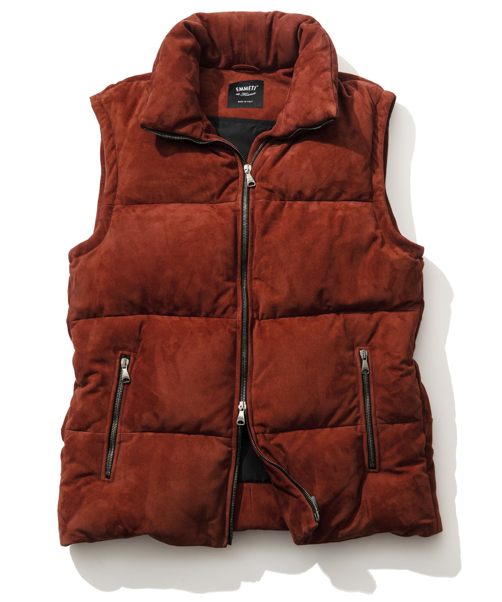 赤みの強いブラウンが目を引くダウンベスト。この手の1着はアウトドア色が強くカジュアルな印象になりがちだが、コチラはゴートスウェードを採用することで上品に仕上がっている。そんな品のいいシェルに中綿とフェザーを90:10の黄金比率で内蔵。なぜこの比率が黄金比かというと、それぞれの特性が関係してくる。ダウンは胸元のふわっとした芯のない綿毛のようなもの、フェザーはいわゆる羽の部分。ダウンの部分の方がフェザーより保温性があるが、芯がないと型崩れしやすいというデメリットがあり、それを防いでくれるのがフェザーだ。通常、ダウンの方が値が張るため50:50の割合が多いがコチラは90:10! ギリギリまでダウンの比率をあげているのがわかってもらえるはずだ。