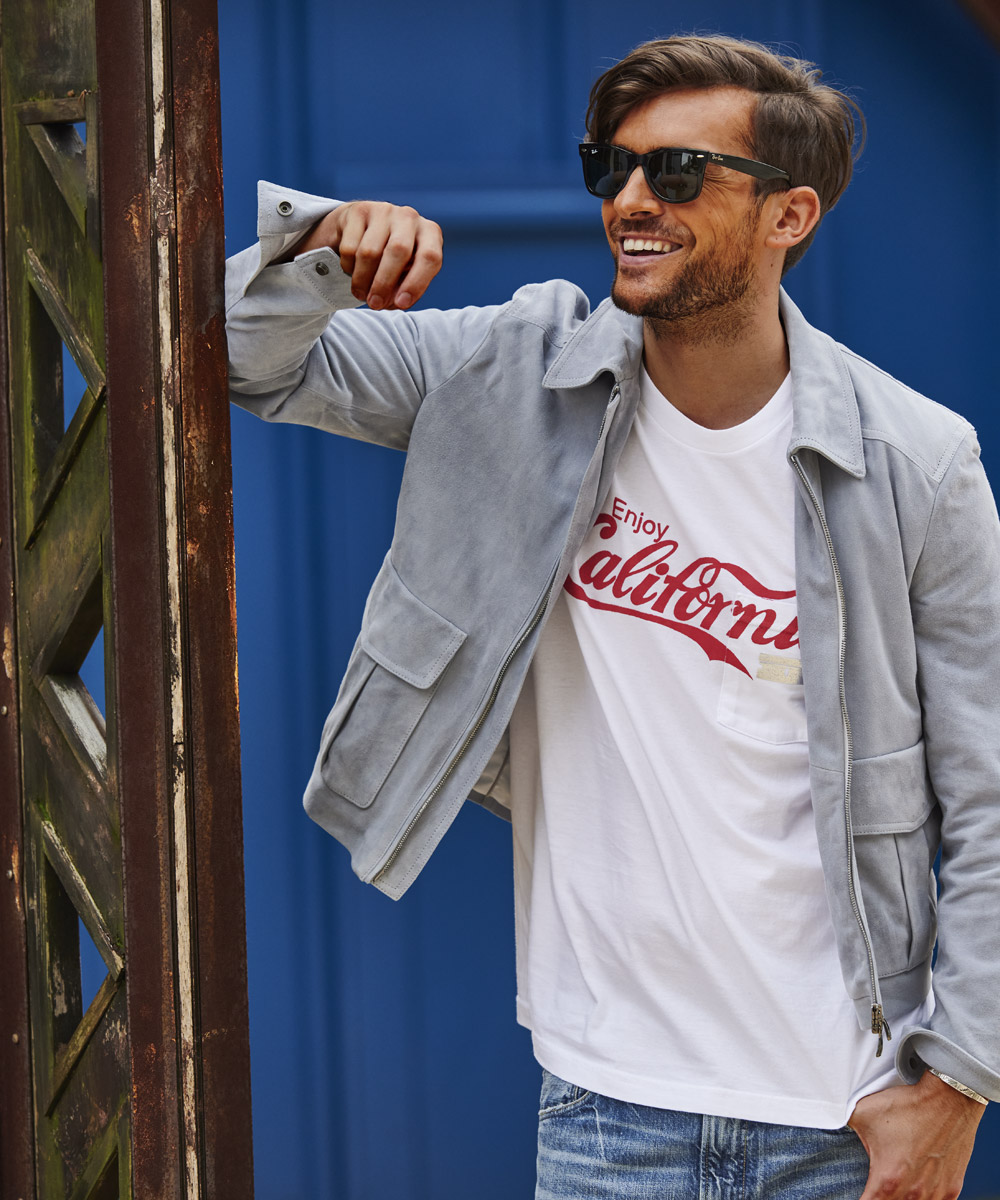 ミリタリー出自のA-2フライトジャケットタイプの形。そんなブランドの定番モデル“コリン”をベースに、爽快なペイルブルーをのせたのがコチラ。ご覧の通り、上品な発色のおかげでミリタリーブルゾンにありがちな野暮ったさが、男らしさを残しつつも上手に中和されているのがわかるはず。これからの季節はもちろん、春先にも使えるこの色は使い勝手がかなりよさそう! しっとりした風合いが大人の品格を着こなしに与えてくれる。