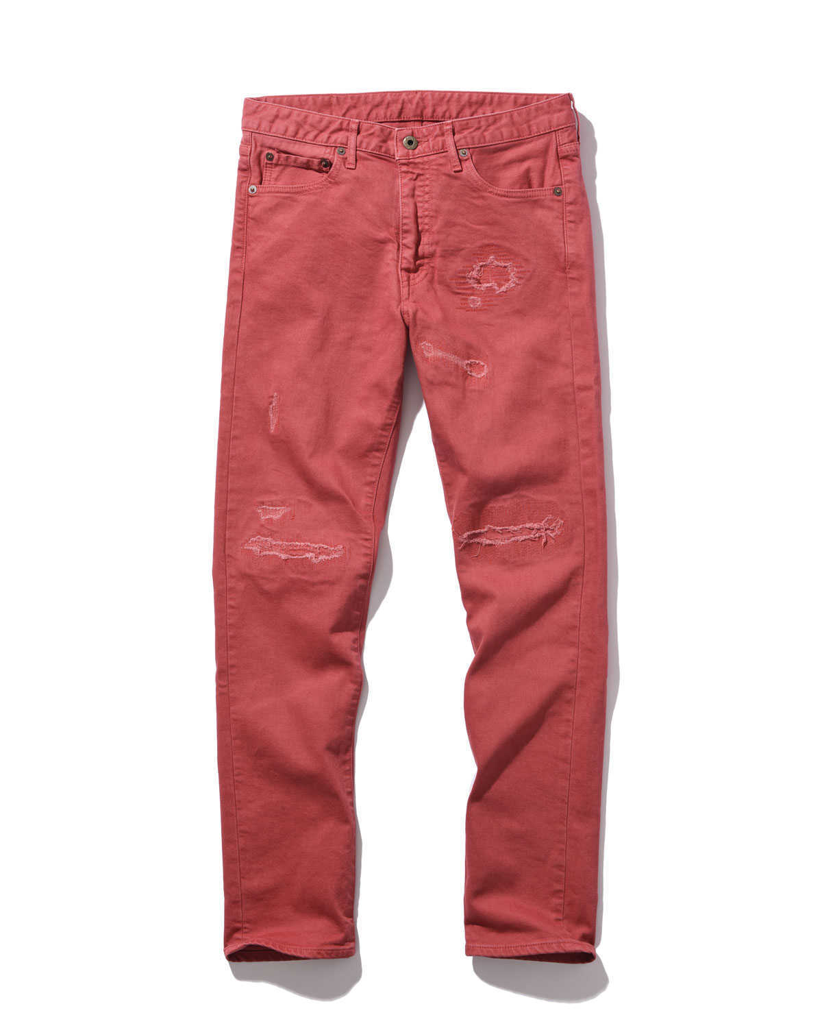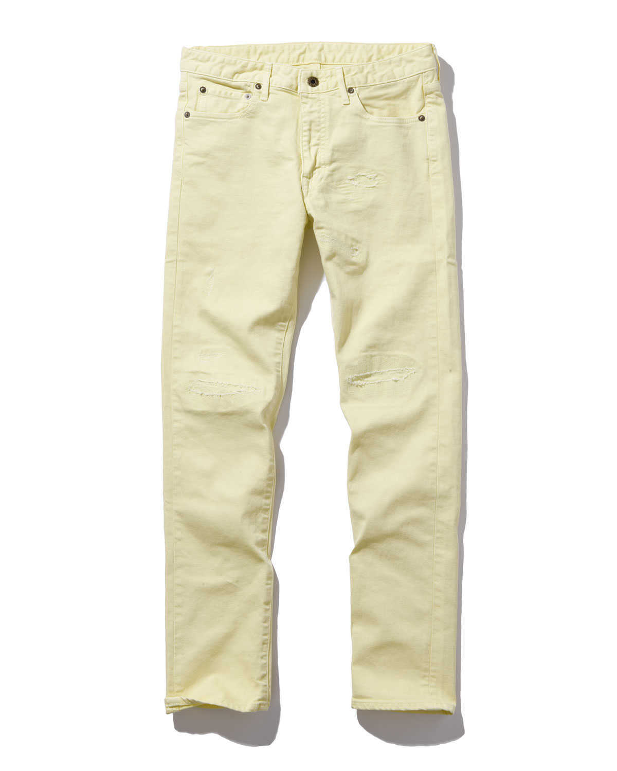 春夏にリリース後、瞬く間に完売してしまった〈ジャパンブルージーンズ〉の新色が待望の登場。デニムの聖地、岡山で製作されただけあり、ストレッチの効きながらも抜群の風合いを放つ生地感に仕立てられている。それにより、カラーデニムにありがちな小僧っぽさがない。また、シルエットは美脚効果が期待できる細身のシルエットに。ポイントになるダメージ&リペアの加工は同色にすることで、さりげないアクセントになっている。今回はウォッシュの効いた味のあるイエロー&レッドをご用意!
