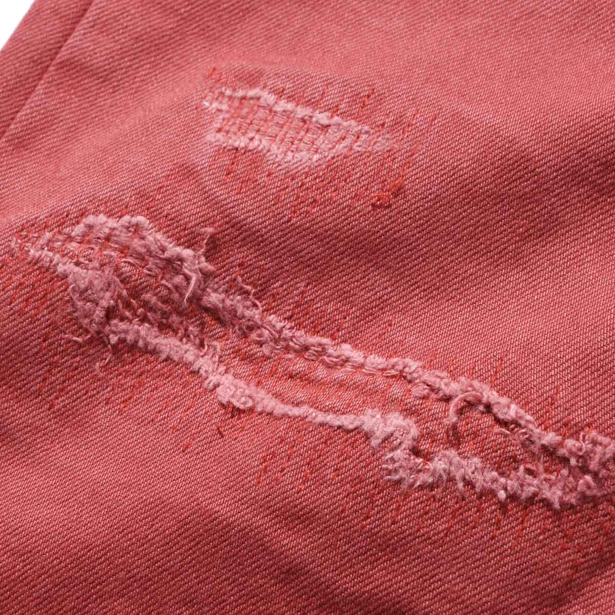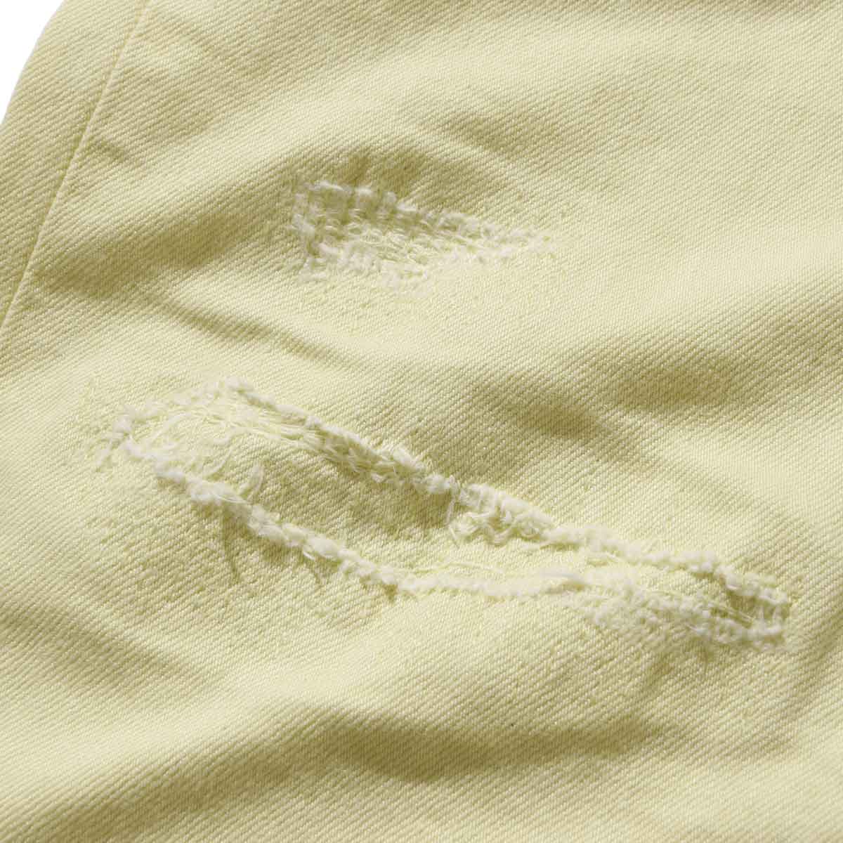 ダメージとリペア加工を施すとハードな印象になりがちだが、コチラは同色の糸で行なっているのでさりげない仕上がりに。それでいて、しっかりと味感は出ているからカラーデニムでも男らしさを発揮できる!