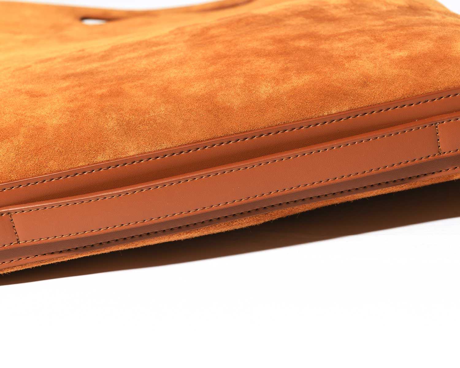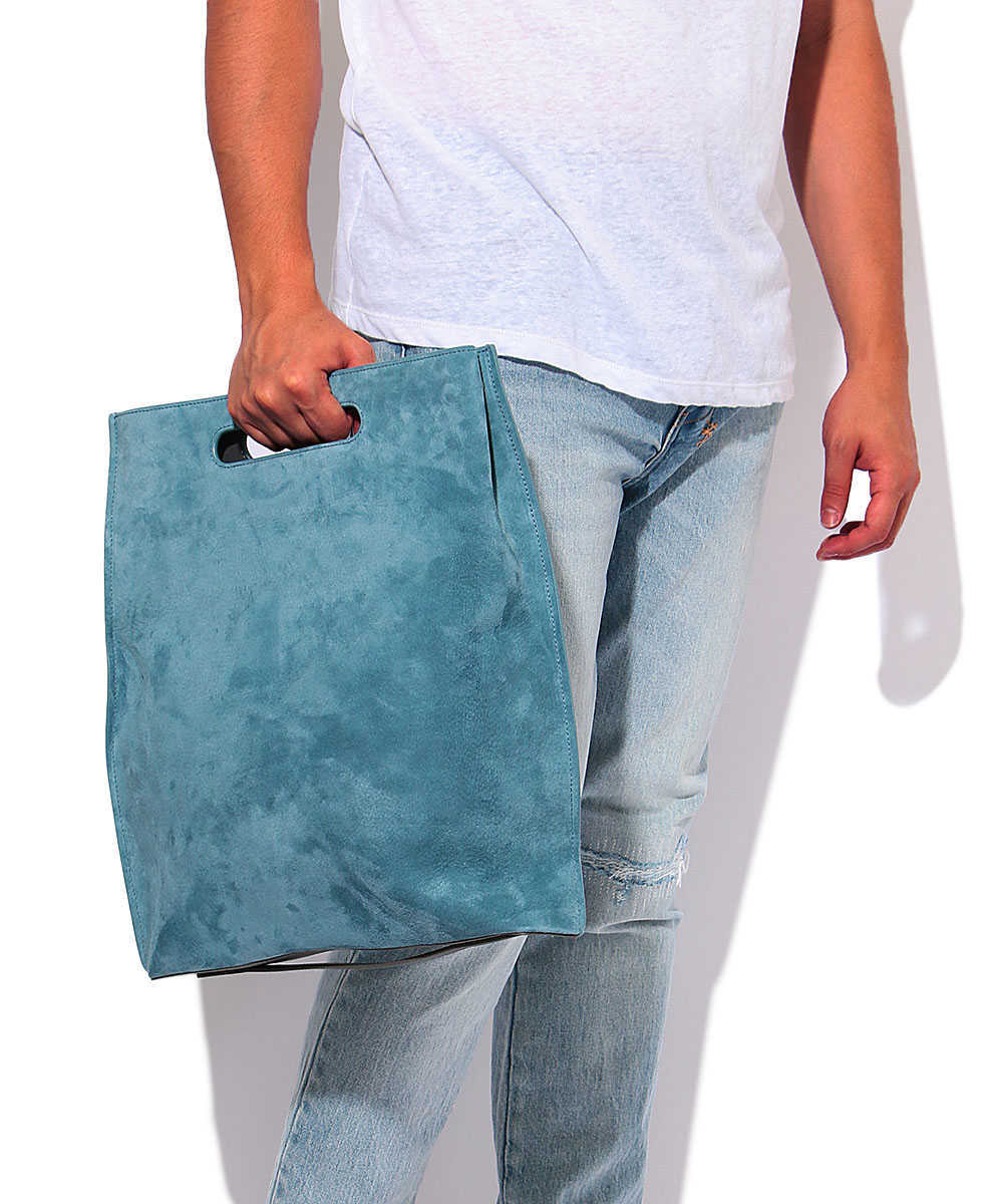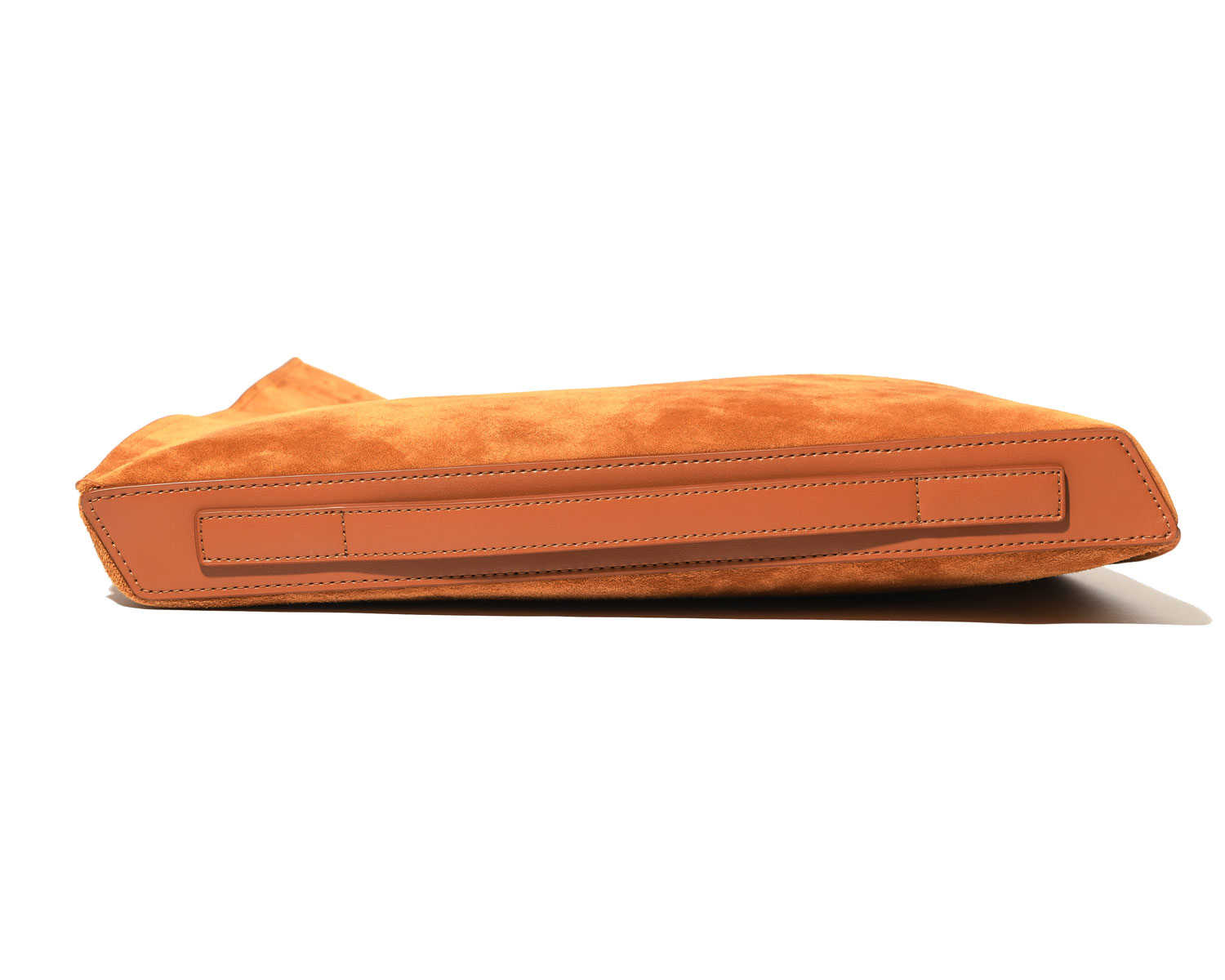 この1品は〈ザ・ディレッタント〉でもともと人気の高い型をベースに素材を別注した代物。人気の秘訣はその利便性にある。持ち手をそのままトートバッグとして使うのはもちろん、折りたたんで底面のハンドルに指を通せばクラッチバッグとしても使えるからだ。荷物の量に応じて、またコーディネートの雰囲気や気分に合わせて使い分けられるのがポイント高いってワケ。そんなバッグを今回、毛足の短い上品なスウェード素材で別注! 珍しいブルーグレーと安定のキャメルをご用意。