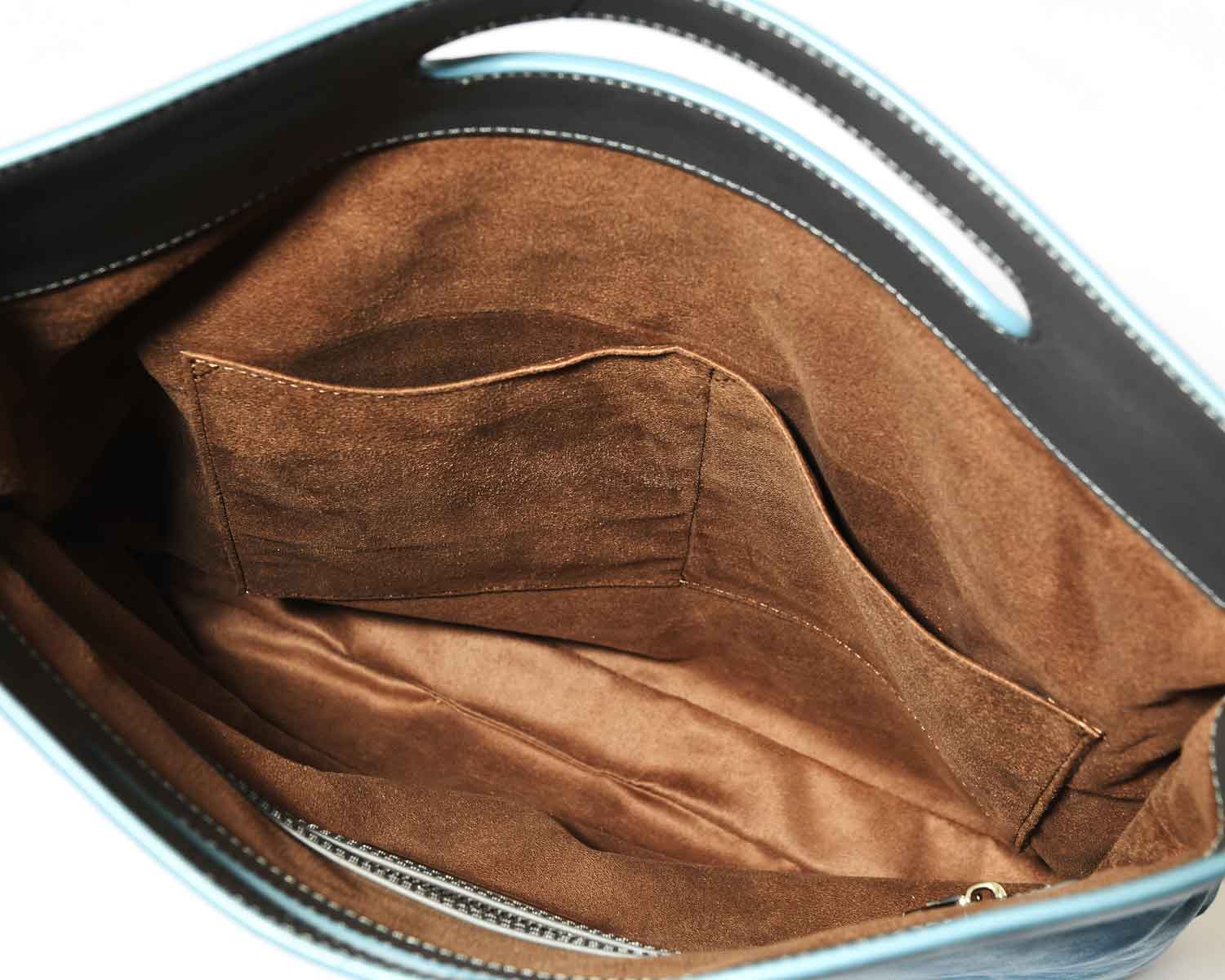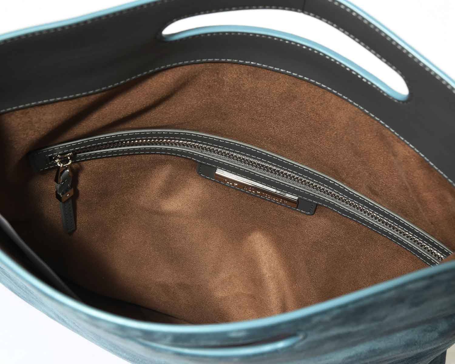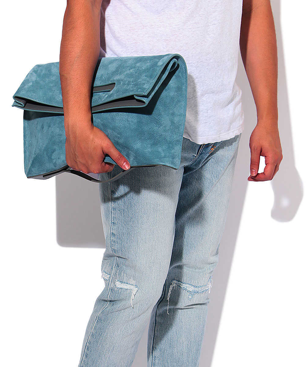 手持ちで持つとまるでレコードバッグのような雰囲気。でも素材のおかげでカジュアルになりすぎない。A4の書類でも難なく入る容量は仕事にも十分、対応できそうだ。一方、荷物の少ないときは折りたたんでクラッチとして。ハンドルを底につけることでシンプルなデザインを邪魔しないようになっている。