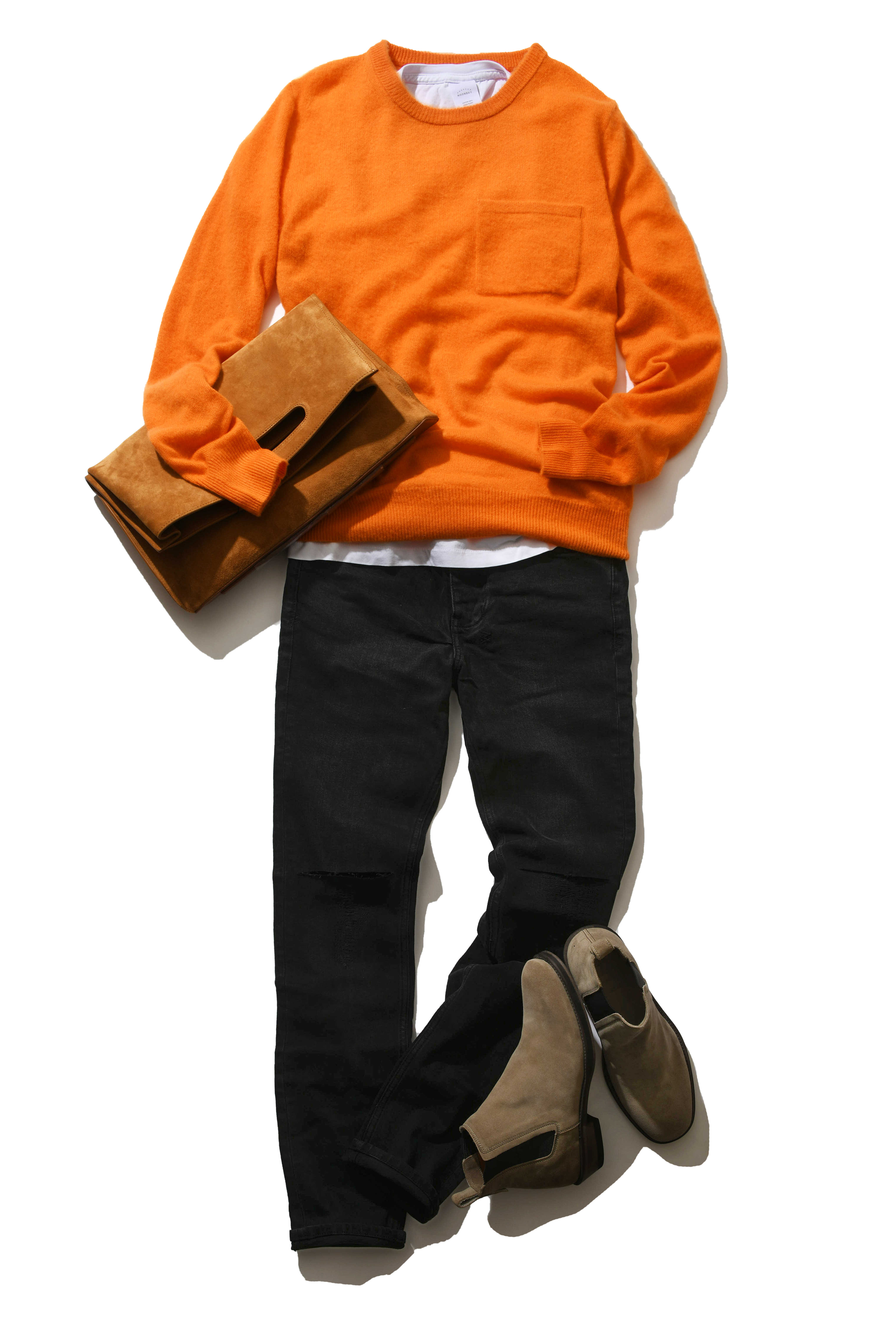 無地ニットといっても選び方は様々。今回は色に注目して、“溌剌とした大人”の印象に仕上げたコーディネートがコチラ。あざやかなオレンジが目を引くこのコーデ。ふわっふわの生地感が特徴の『Safari Lounge』別注〈レミ レリーフ〉のカシミヤニットに、黒デニを合わせればご覧のとおり。これだけで大人っぽく仕上がる。足元にスウェードブーツを加えるとグッとリッチな仕上がりに! 季節感をうまく取り入れた、いいとこ尽くめの秋コーデの出来上がり。