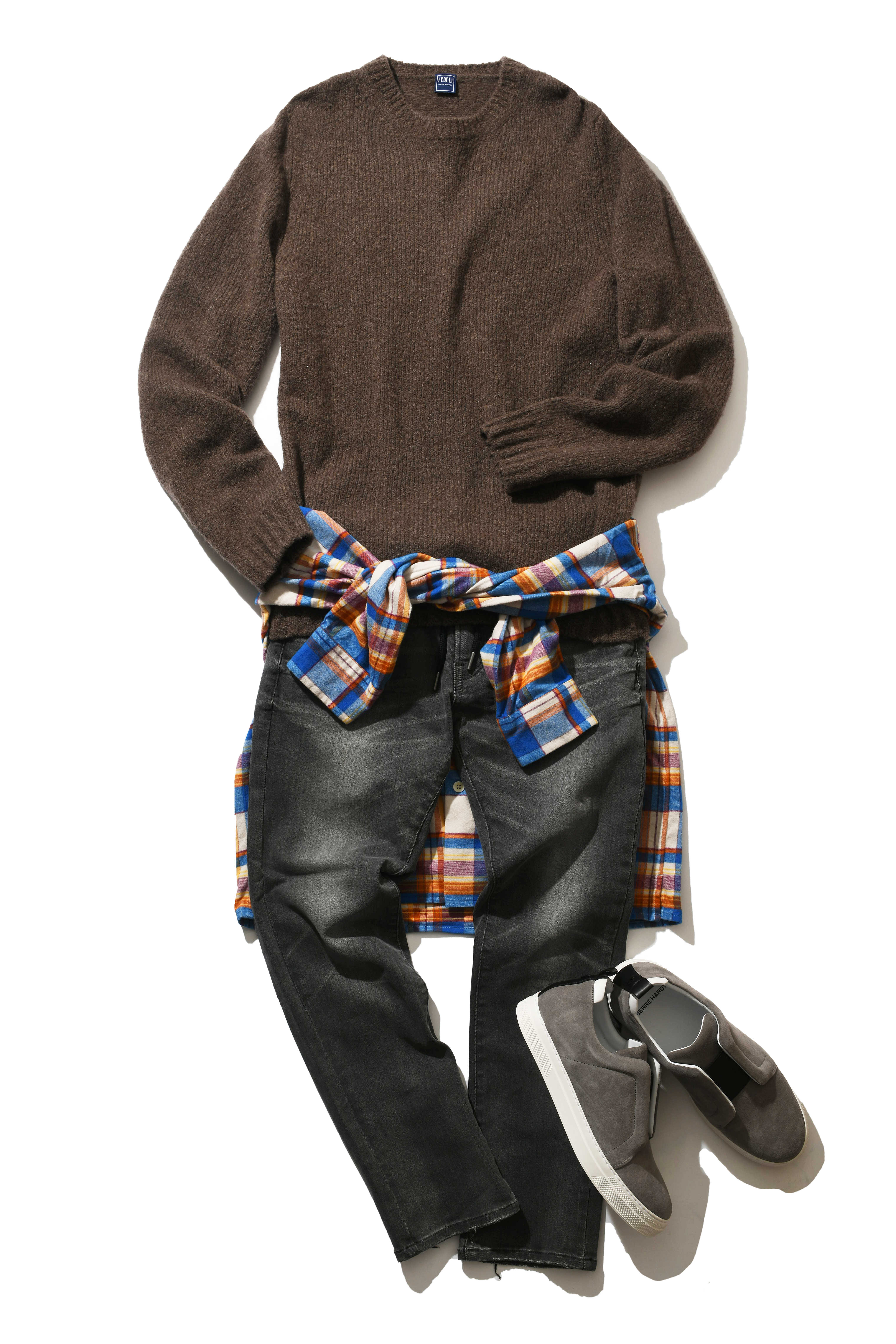 いろんな着こなしにハマってくれる万能ニットがこちら。落ち着いた印象のブラウンのニットは、シンプルな組み合わせでシックに仕上げたい。今回はそれに合わせて、チェックのネルシャツをプラス。西海岸テイストにも活用できちゃう優れモノだ。シャツを腰に巻けば、コーディネートのアクセントになるし、男らしい雰囲気も醸してくれる。こんな感じで気分に合わせて楽しめちゃうのが最大の魅力だ。もちろんこのシャツ以外にも、いろんなアイテムとの相性もバッチリ。