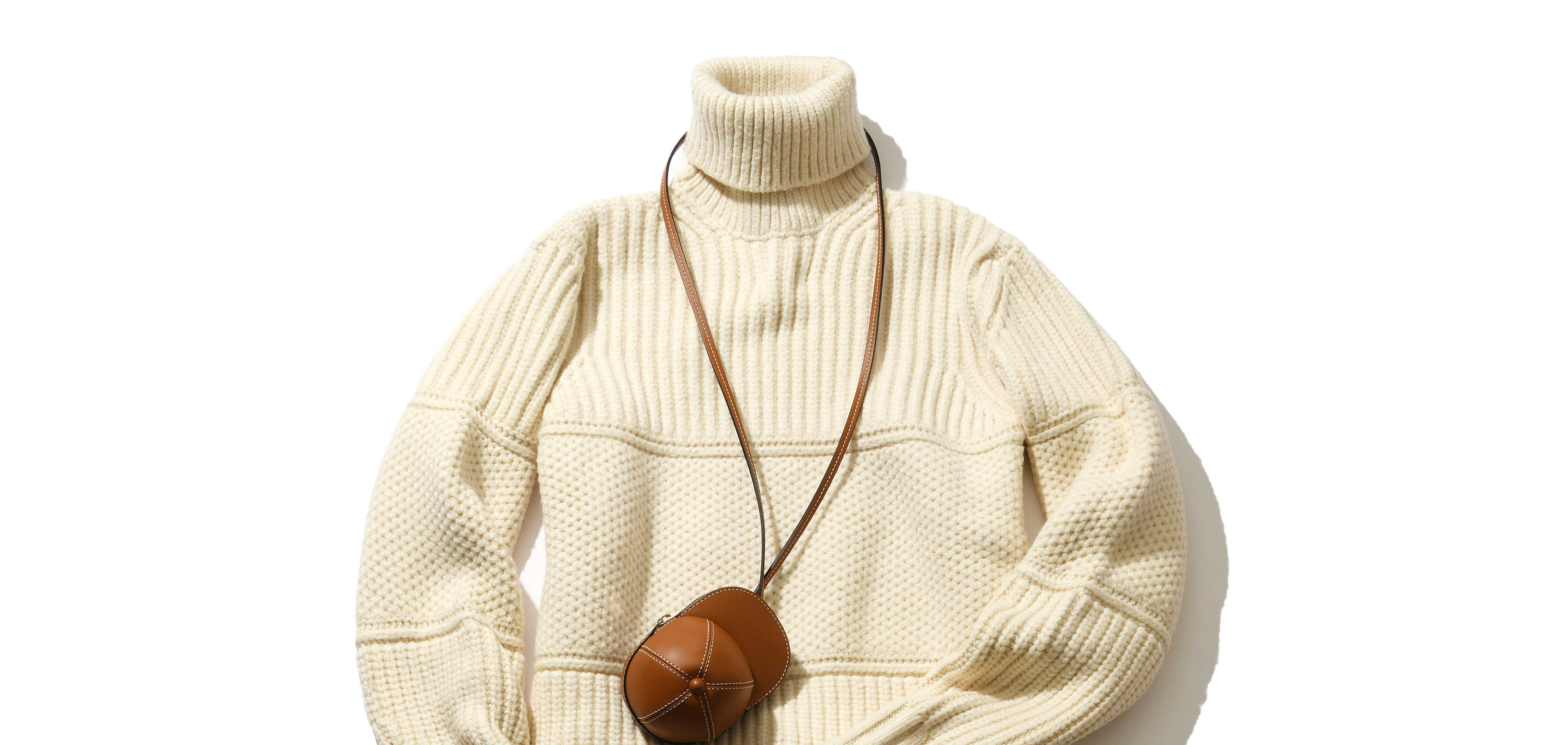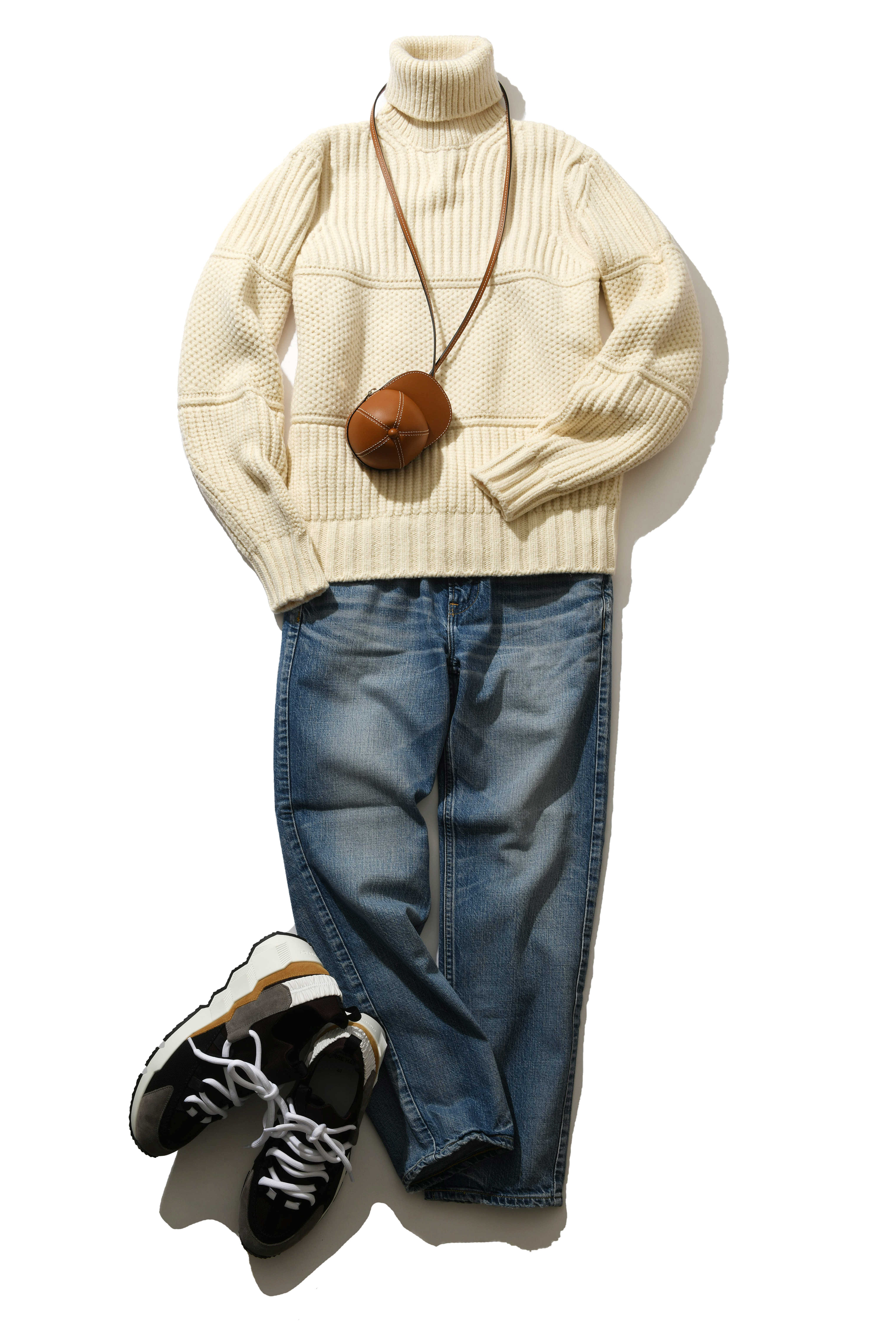 無地ニット選びのお次の選択肢といえば、首回り。タートルネックを選べばクリーンで優しげな印象に。このニットのポイントは、マルチに切り替えられた編み地。こんな切り替えが入ったタートルネックであれば、白×デニムの定番コーデも単調な仕上がりにはならない。優しげな大人の雰囲気はそのままに、さりげなく他との違い出しもできるってワケだ。アクセントとして、アイコニックなキャップバックで遊び心もプラス。こんなかわいらしいバッグがあれば、話のタネにもなってパートナーと楽しい時間を過ごせること間違いなし!