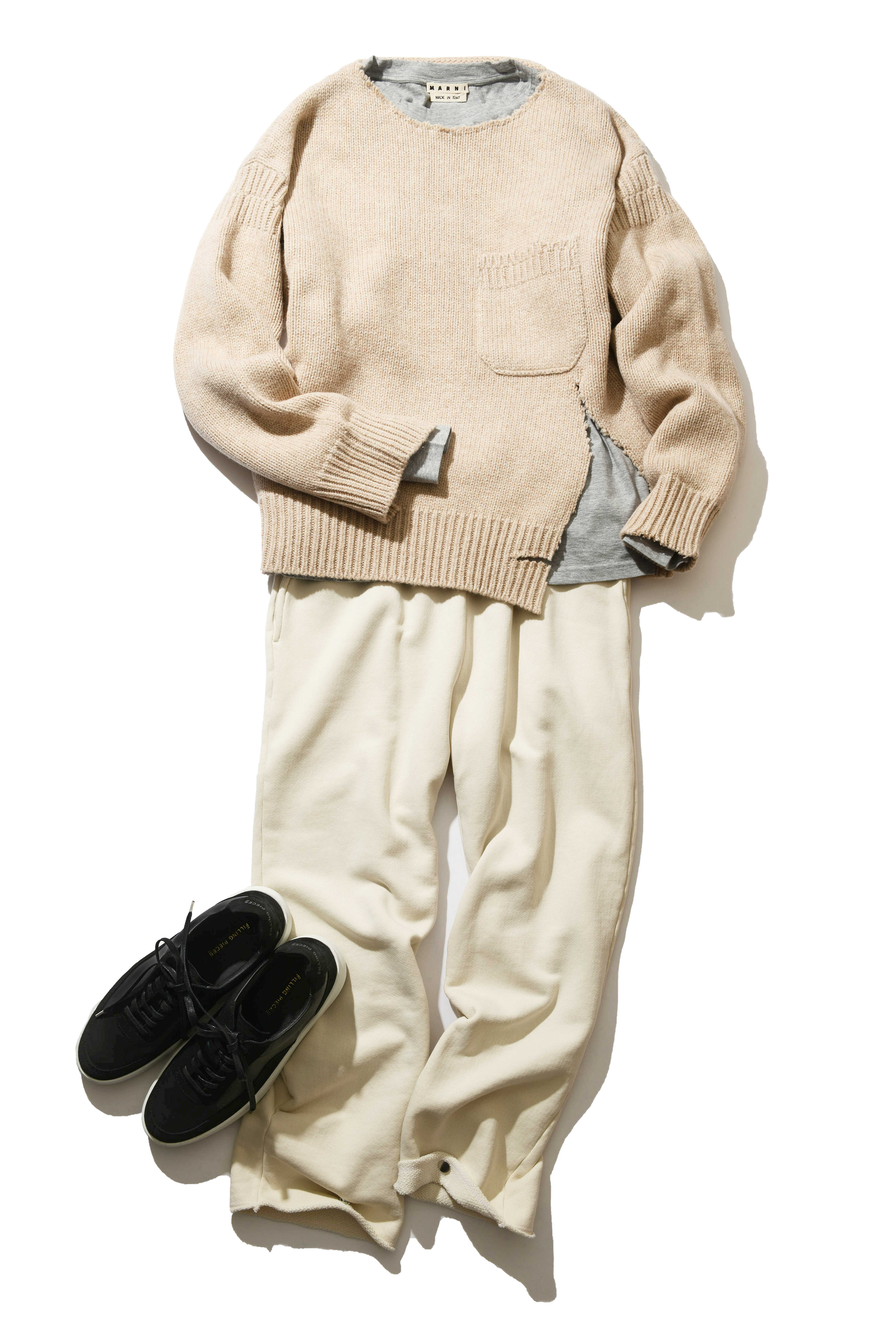 シンプルなアイテムこそ、ブランドのご威光を借りてみるのも1つの手。たとえば、〈マルニ〉のアイテムを使って、ブランドの魅力を存分に生かしたコーディネートがコチラ。主役のニットは、シェットランドウールを使用した高品質な素材が特徴。ボディに大胆なダメージ加工を施してニュアンスを表現するのが〈マルニ〉らしさだ。コーディネートするときは、他のアイテムはシンプルにまとめてニットの存在感を生かそう。このやりすぎない洒落感がアナタの好感度をもっと引き上げてくれるはず!