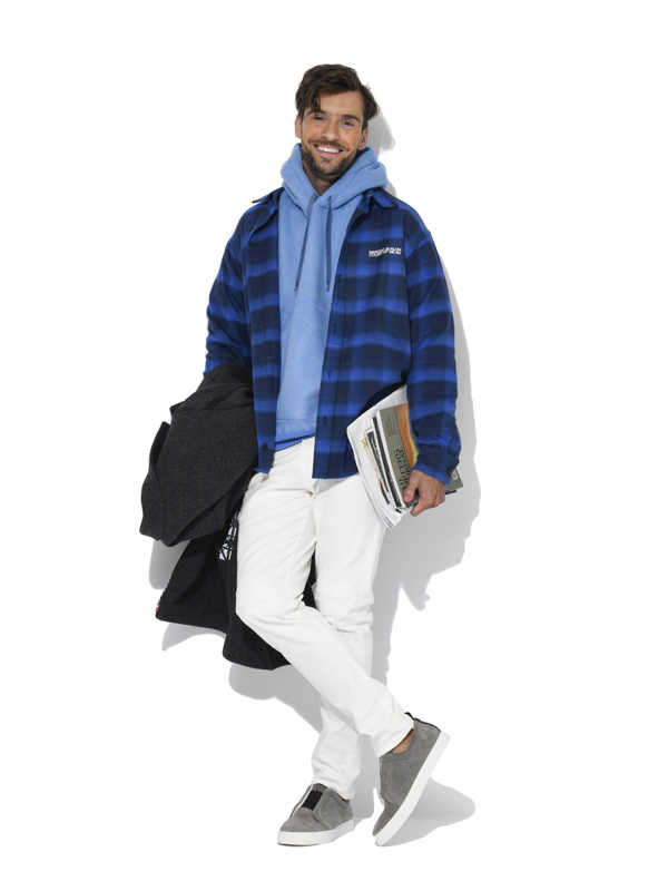 ブルーのパーカに合わせてチャックシャツも同色系を選べば、着こなしに奥行きが増すとともにトーン・オン・トーンで簡単に洒落者の装いが完成!