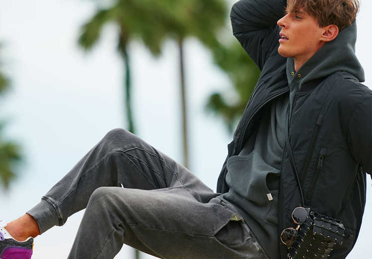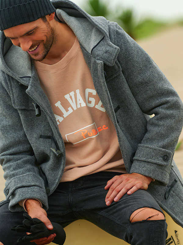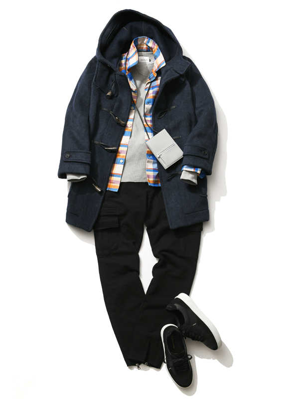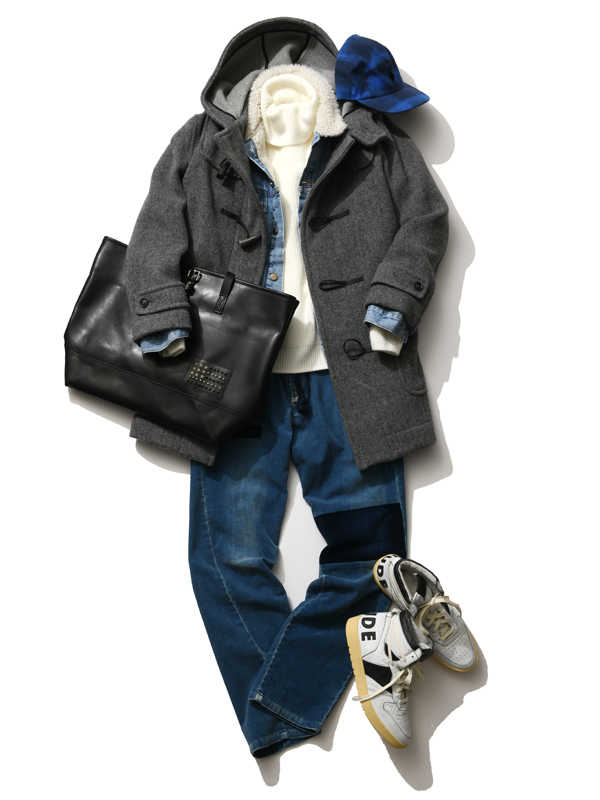 定番のダッフルコートはそのまま上品に着るよりは、あえて潮っぽく着こなす方が新鮮! スウェット&デニムの王道コーデに合わせるだけでも違いを出せるはず!