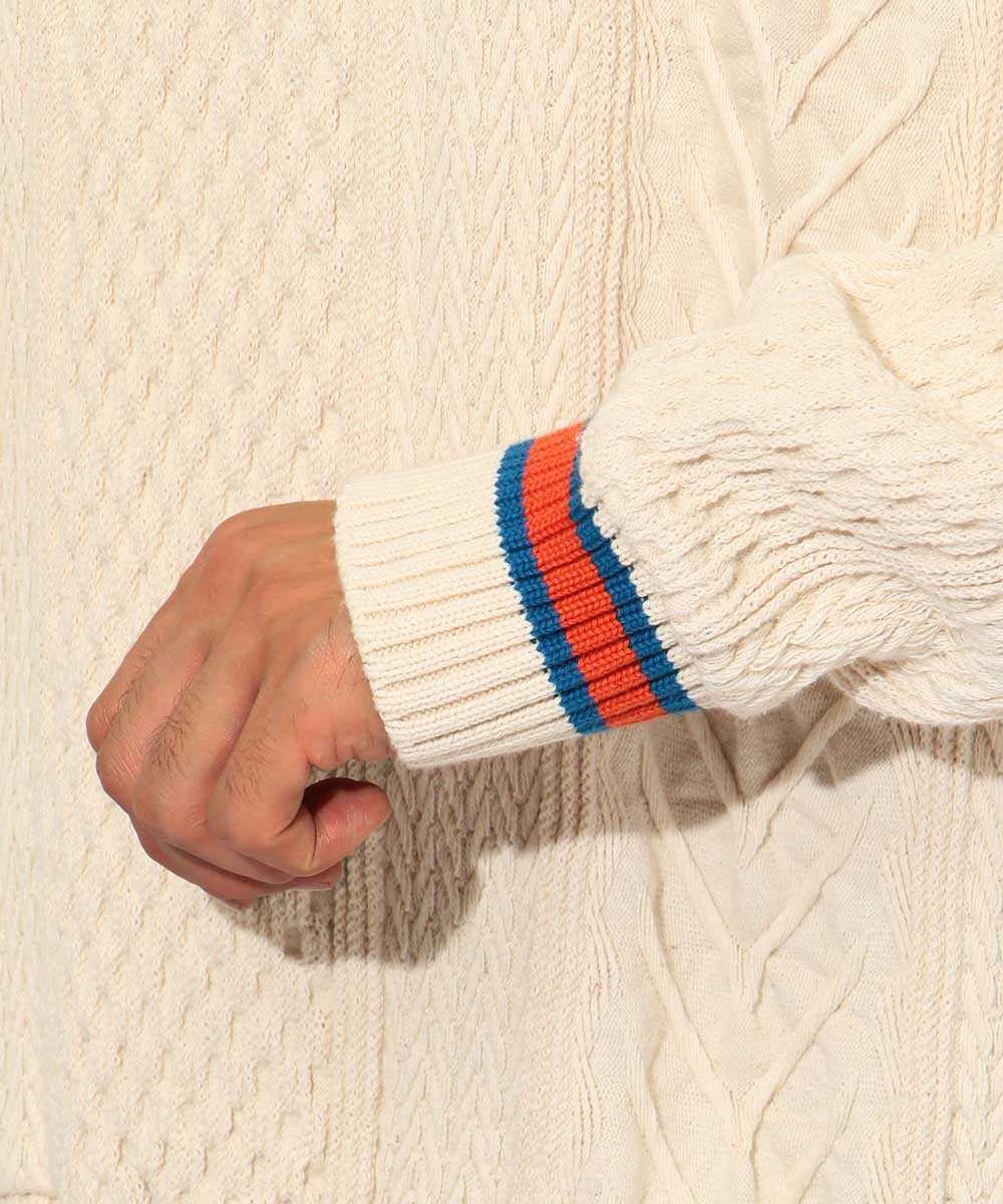 まず最初に紹介するこのアイテム。一見、シンプルなケーブル編みのニットに見えるが実は違う。なんと、特殊な製法を使いカットソーの生地でケーブル編みを表現した1枚だ! ニットの風合いとは違う、乾いた質感はどこか海を連想させる代物。そんな生地は着心地も軽やか! ニットのよいところとカットソーのよいところを取り入れたハイブリッドなアイテムってワケ。