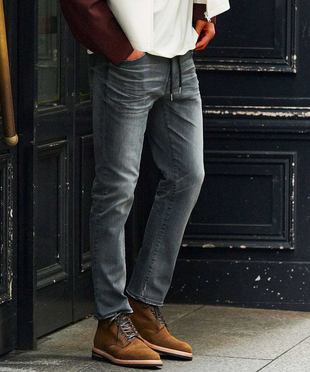 M よくぞ、聞いてくれました! 実はこの褪せたブラックは通常展開のないカラーリングなんですよ。それに加えて、リベットやボタンをシルバーカラーで統一し、より脚長に見えるようにレングスも少し短くして足首まわりをスッキリさせています!