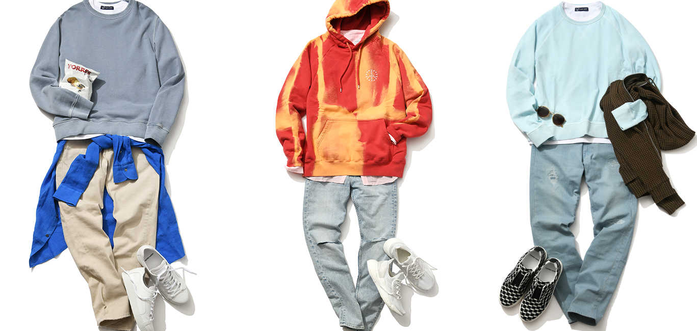 冬の寒々しい空気の中なら、ダークトーンの引き締まった着こなしも悪くないけれど、柔らかな日差しが多くなるこれからの季節は、もう少し陽気な西海岸風の装いのほうがいい!? そこでおすすめなのが、普段からよく着るパーカ&スウェットを海や太陽を想起させるいいカラーものにすること。さらに、リラックス感のあるシルエットを選ぶことで、ほどよくゆる~い空気感を纏うLAスタイルにぐっと近づくってワケ。