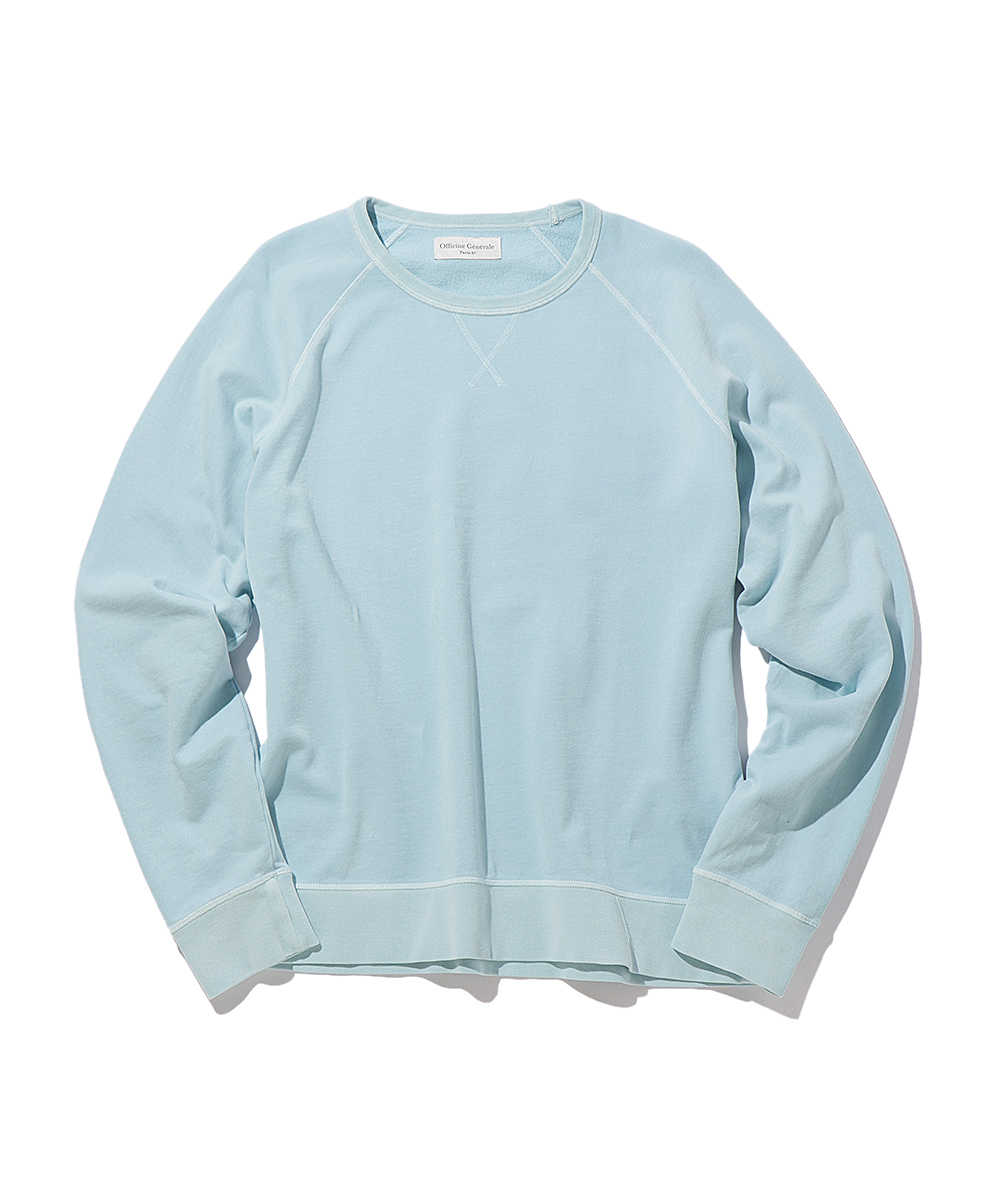 〈オフィシン ジェネラル〉と言えば、他ではあまり見ないような絶妙なニュアンスの色みが毎シーズンお目見えするため、ついついシーズンごとにカラー違いを手に入れたくなってしまうブランドだ。そして、このスウェットシャツの最大の魅力も、やっぱりこの色み。早朝の青い海や空を想起させるような淡〜いライトブルーは、ブランドこだわりのピグメントダイにより実現したもの。この爽やかさを最大限生かして、夏の始まりには白Tの上から、さらっと肩掛けにしてコーディネートのアクセントにするのもアリだ。