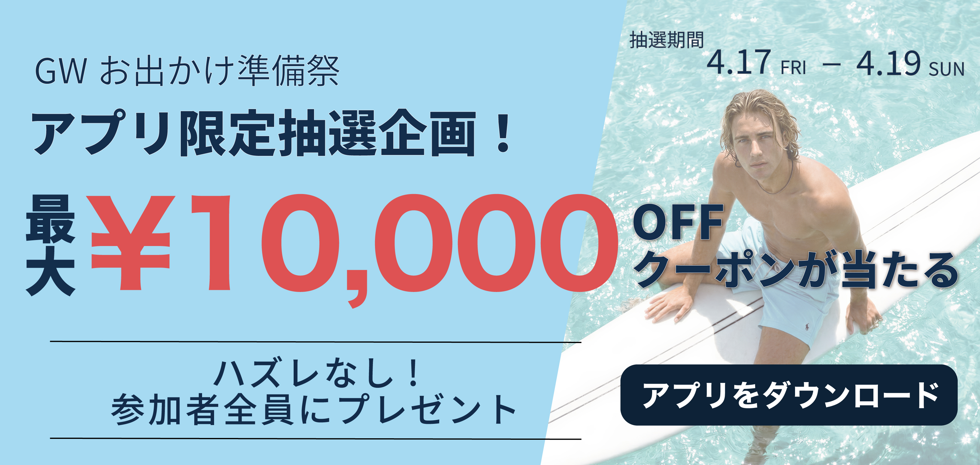 4/17(金)〜4/19(日)の3日間、アプリで最大¥10,000 OFFのクーポンが当たるハズレ無しの抽選が開催!