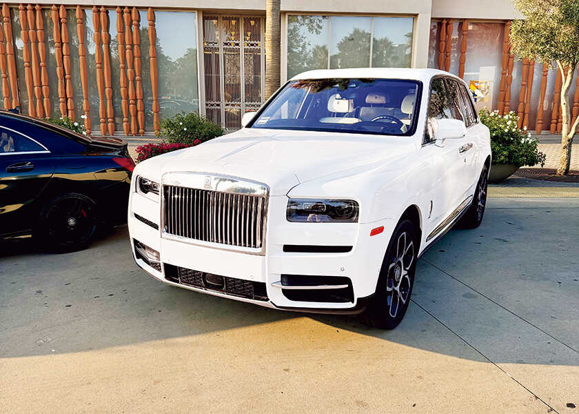 〈 ロールス・ロイス〉初のSUVとして登場。オフロード走行にも適した6.75Lの大排気量エンジンを搭載しつつも、徹底した防音処理を施し、高い静粛性を実現。快適さとラグジュアリーを両立している。リッチな内装はオーダーメイド。ジェイミーはモノトーンで製作したみたい!
