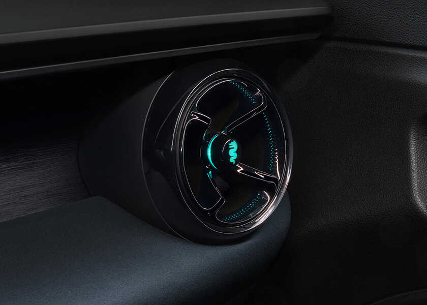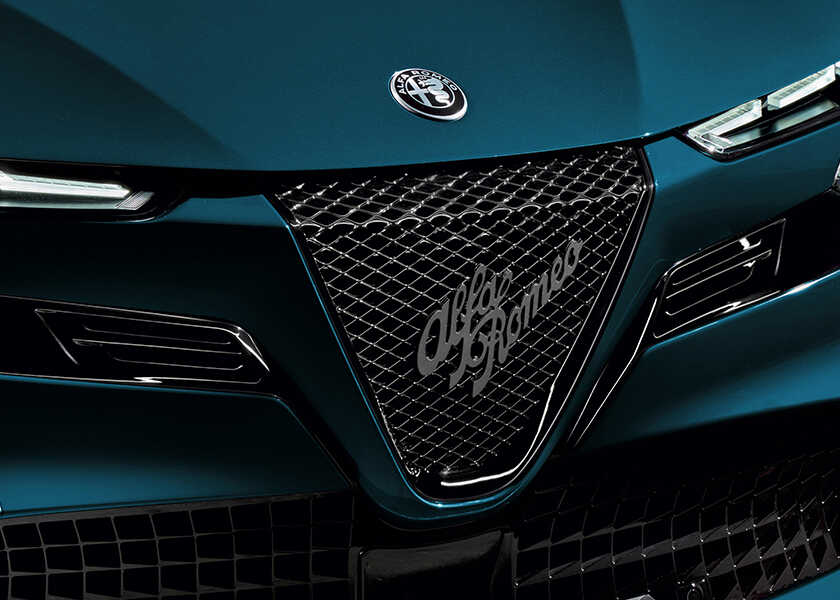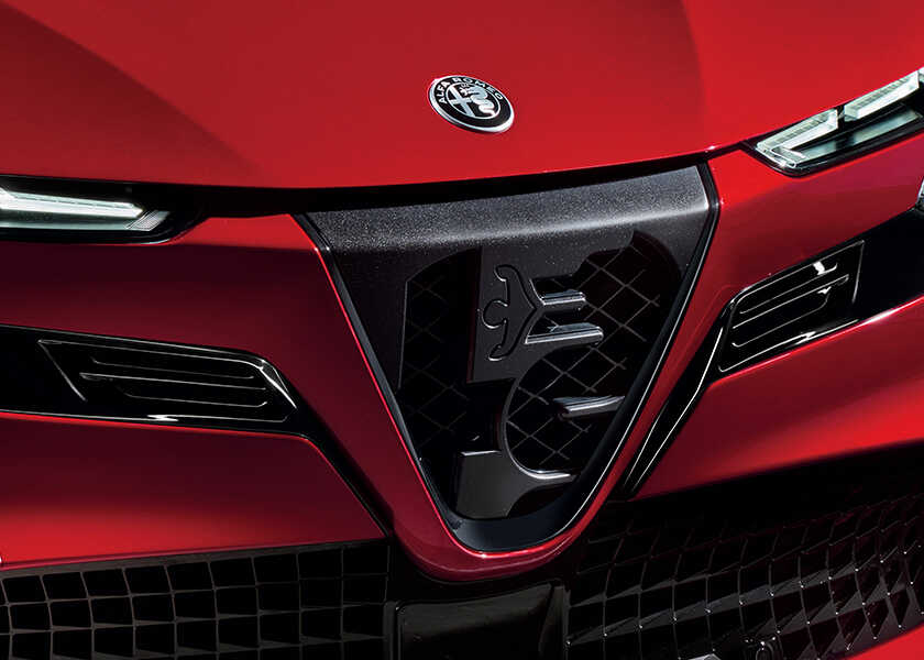 〈アルファ ロメオ〉では既視感のなかった、横幅細目の背高フォルムながら、やっぱりグリル周りの作り込みにイタリアンブランドな説得力を感じさせる。まず、ちゃ〜んと伝統の盾型の三角グリル“トライロープ”が鼻先に鎮座している。この中には伝説の“人をのみこむ大蛇”ビシォーネと赤十字が、現代的でシンプルなパターンに変換されて配置され、とてもデザイン的だ。これは個人的にクスッと笑えたブラックジョークだな、と思ったのは、ビシォーネに飲み込まれる人型の柄が、人の命を守るセンサーとして使われているところ。こういうネタっぽさも〈アルファ ロメオ〉ならではの芸当な気がする。