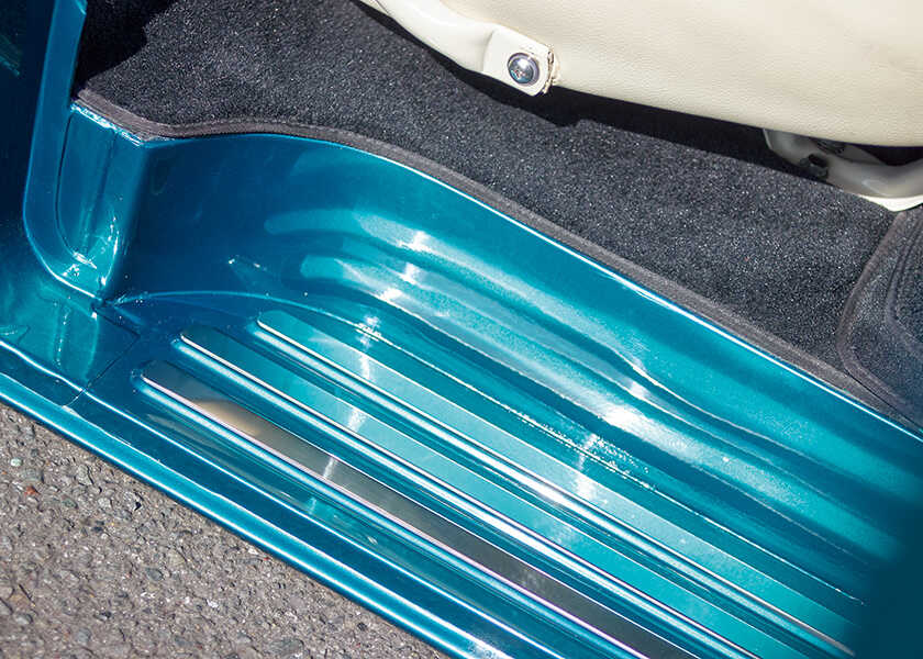 最大に車高を上げてもこの程度。だが乗り心地は意外にも固くなく、高速巡行も快適だとか。「ボディが着地してこそ。それでもエアコンも効くし、普通に街乗りできるよ」仕上げるまでに家が買えるほどの費用が必要だったという、〈フォード〉F100ローライダーカスタム。だがイクラさん曰く、単に予算があれば完成するものではないとか。「モールやステップのステンレスなどは、オリジナルに加えて手作業による叩き出しで作ってある。車文化が成熟しているアメリカにはヴィンテージカーのリプロダクト品は揃っているけど、それでも足りないものも結構ある。今みたいにネット販売がない時代だったときは手に入りにくくて、管楽器を作っている工場とかに頼んで作ってもらっていたよ。今だとここまでキレイに作ってくれるところは、なかなかないかもね」