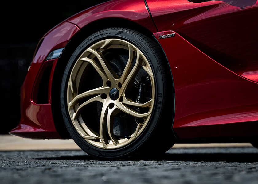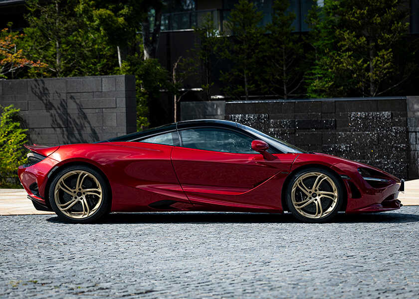 また、750Sの造形美に感心しつつも心惹かれたのは、ペイントの美しさだ。ラグジュアリーな〈マクラーレン〉ともなると、自分だけの1台を求める声も多いと聞くが、そんな顧客のニーズに応えるために〈マクラーレン〉にはMSO(マクラーレン・スペシャル・オペレーションズ)というビスポーク部門がある。デフォルト以外の外装カラーや特別素材の内装、キャリパーなど、内外装からペダルに至る細部まで、様々なオプションパーツが選べるようになっている。ちなみに目の前にある750Sのボディカラーはアマランスレッド。MSO用の中で選べるカラーのひとつだが、こちらはなんともいえない大人の赤がいい。ソリッドなレッドと違い、落ち着いたトーンに深みが感じられ、光の当たり具合によって様々な表情を見せてくれる。たとえば、よく晴れた日、木立の影を映しながら抜ける道、夕暮れどきや夜の街……。天候やシーンによってそれぞれに違った表情を見せてくれるなんて、なんと贅沢なことか。“ペイントも性能のひとつ”だと思っているが、MSOのペイントはまさにカラーマジックといえる高性能。「速いものは美しくあるべき」といったメッセージも聞こえてきそうだ。