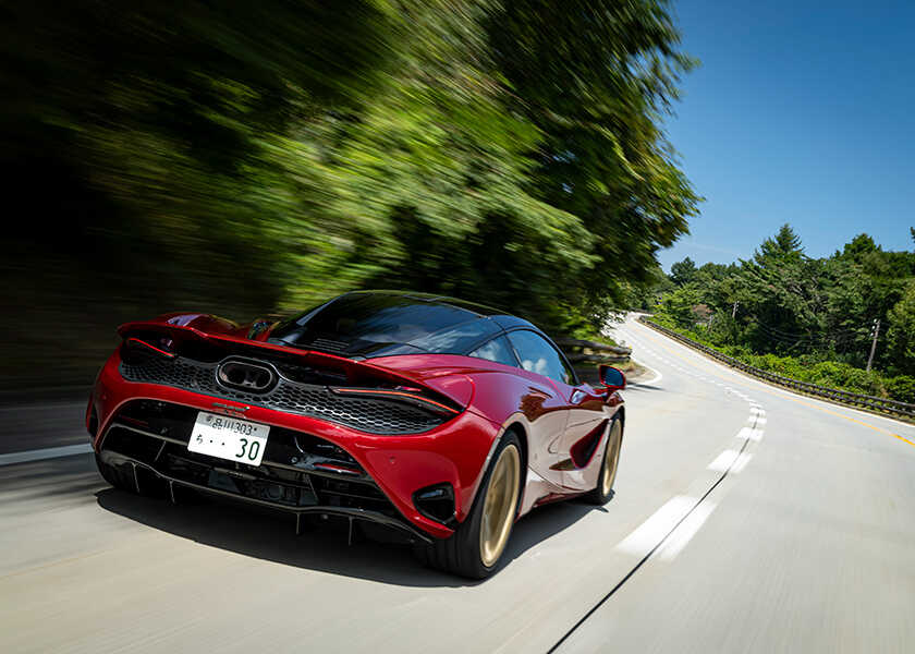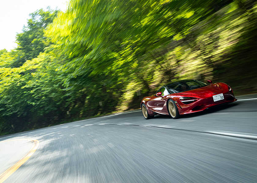 コースはアルトゥーラのときと同じ、高速+峠のセット。ホテルを出て一般道をゆるりと流しているものの、これほどのスーパーカーとなるとやっぱり身が引き締まる。ぱっと見コンパクトなボディ(全長4569×全幅1930×全高1196㎜)は安定感のある幅広サイズだが、なにしろ車両重量(乾燥重量)は1277kg(軽!)。加えて4ℓV8 ツインターボエンジンが絞り出す最高出力は552kW(750PS)/7500rpm、最大トルク800Nm/5500rpmなのだから、身に余る光栄級のスペックに背筋が伸びる。さて、そんなクルマとさっそく高速道路へと繰り出したのだが、合流時にアクセルをひと踏みしたとたん、あとはご想像どおりの展開に。V8ツインターボの雄叫びを背中で聞いたと思ったら即座にワープ。路面の凸凹を上手にいなしながら、速度が上がるほど安定していくような異次元の走りを感じさせてくれた。そうかそうか、750Sの最高速度は332㎞/h。素直に言うと「これ、レーシングカーでしょ?」だ。