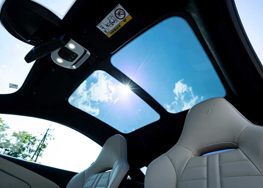 また、車高の低いスーパーカーであっても、広いフロントウインドウはストレスを感じさせないポイント。どのクルマも見晴らしがよく開放的なのが〈マクラーレン〉の美点だが、GTSにおいてはさらに上をいく感じがした。というのは、頭上からテールゲートへと続くルーフはすべてガラス張り(ボタン操作で瞬時に遮光可能)。しかもCピラーまでもがガラス張りとなっていて、室内の開放感はかなりのものだ。そしてこれらの恩恵により、なんと360°の視界が広がるというのだから、よく考えられている。旅先で出会った広い空、高原のワインディングロードで見る新緑や紅葉など、そんな風景がパノラマで味わえるといったらどうだろう。きっと助手席のパートナーだって前後左右を見渡して、大喜びするに違いない。さらに室内のサウンドシステムといえば、ハイエンドオーディオの代表格〈バウワース&ウィルキンス〉。合計12個のスピーカーからお気に入りの曲を楽しみつつクルージングできるのだから、これは「旅がさらに楽しくなる」というものだろう。さて、このGTS。走ってみると、勇ましいV8エンジンの存在を後ろで感じつつも、室内はあらゆるノイズが軽減されているのだろう、なんとも静かで快適ということに気づく。特に発進時は、ドライビングモードがコンフォートの場合、クワイエットスタート機能のおかげで静かな発進も思いのまま。品のよさはこんなところにも表れてくる。