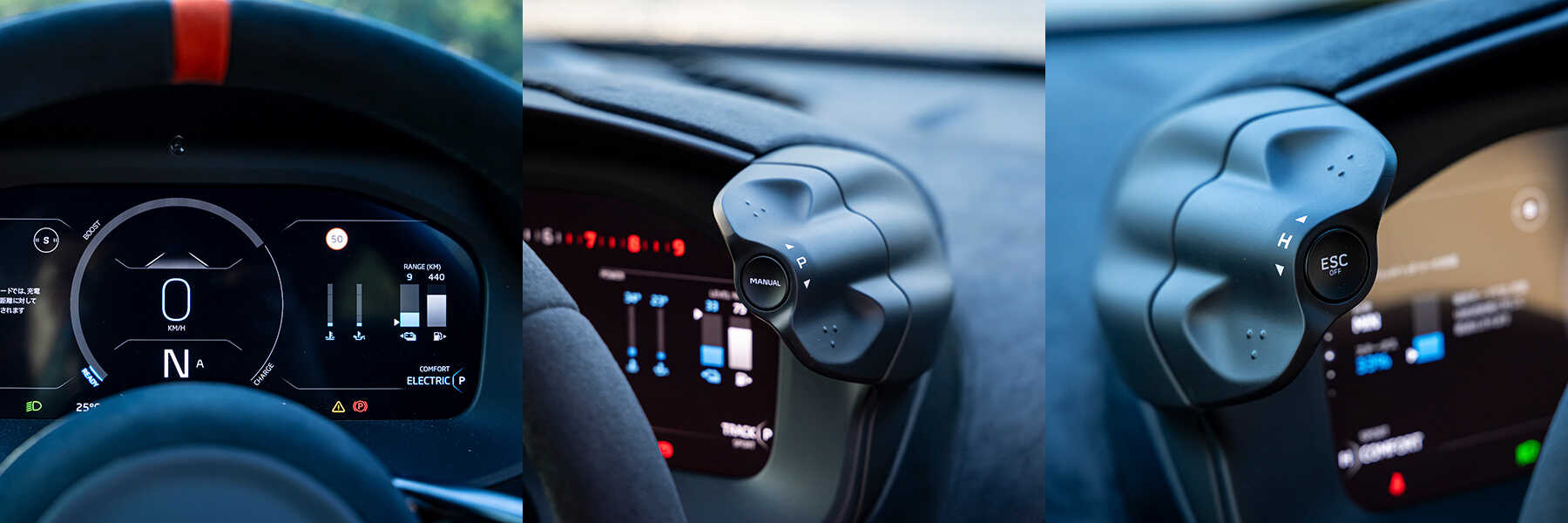 スタートのドライビングモードはエレクトリック。ドライビングモードの切り替えはハンドル右奥にあるレバーのアップダウンで。サスペンションのモード設定はハンドル左奥にあるレバーで行う久しぶりに対面したアルトゥーラだが、当然その美貌は変わらない。低いノーズに奥まった位置にあるヘッドランプ、しっかりと道路に張りつくかのようなフォルムは、相変わらず強さと流麗さ、洗練を感じさせてくれる。見るほどに色褪せない価値を感じるところだ。また、「すべてのものには理由がある」というのは〈マクラーレン〉のデザイン哲学だが、もちろんこのアルトゥーラにも宿っている。空気抵抗の軽減、エアフロー、ボディバランスなど、美しいフォルム中に技術的な裏づけが透けて見えるだけに、オーナーならますます愛おしくなるというものだろう。