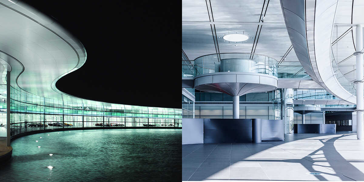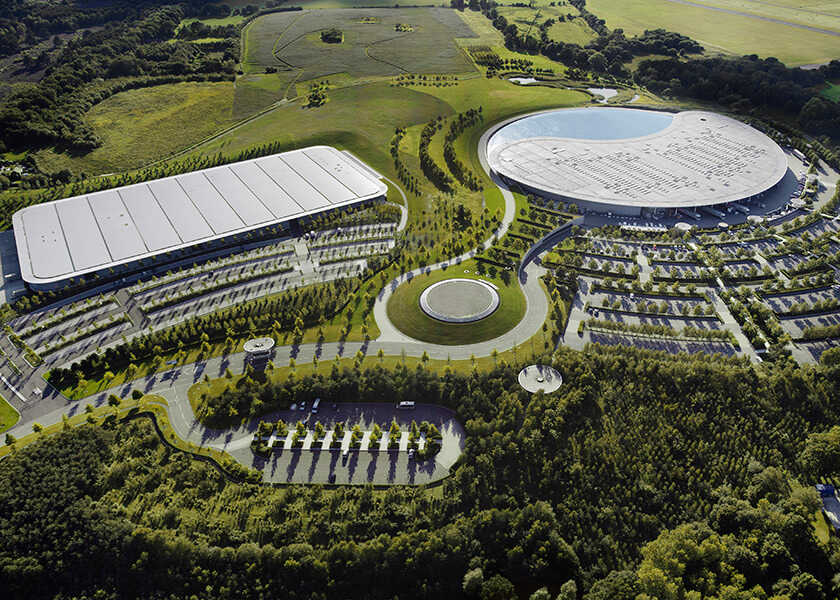 池をたたえた円形の建物がMTC。建物と湖は陰陽をモチーフとする完全な円を描いているのはご覧のとおり。池にある大量の水はヒートエクスチェンジャーを介して社屋のエアコンディショニングや風洞実験から発生する大量の熱の放出に寄与するなど、デザインと機能性をも兼ね備えている。奥にはあるMPC(四角い建物)で、MTCと地下で繋がっている