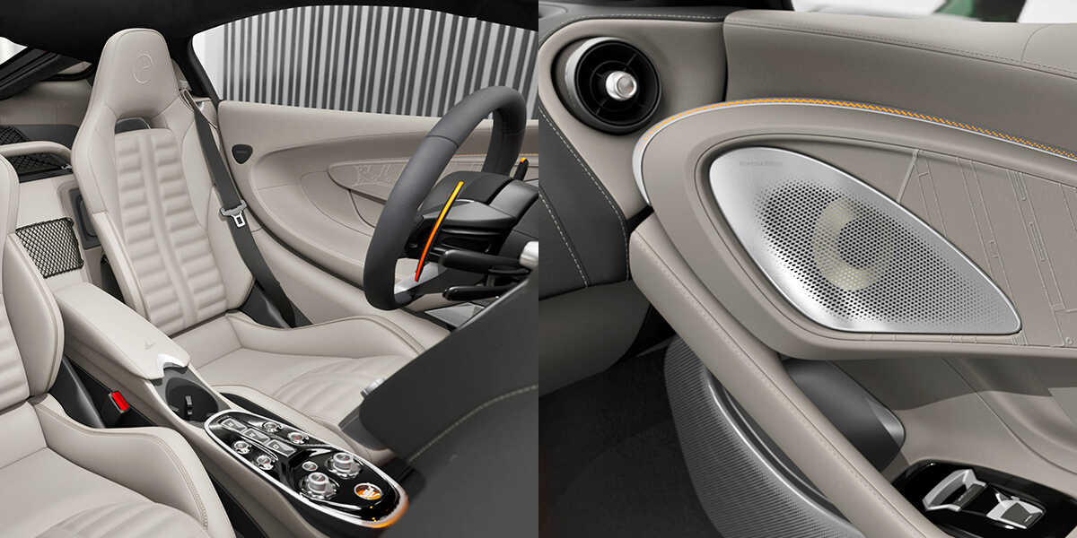 マクラーレン・テクノロジー・センターの象徴である美しい湖が、建物のガラスファサードに映り込む情景から着想を得たテーマ。「リフレクション・グリーン」ペイントは、シルバーメタリックフレークを含む独特の下地を持ち、水面に輝く陽光が MTCのガラス建築に反射する様を再現している。ボディカラーとの対比を強調するため、ホイールにはダークパラジウム仕上げを採用。インテリアには、スコリアグレー・セミアニリンレザーのシートにトーナルスティッチを施し、上質な仕立てを加えた。