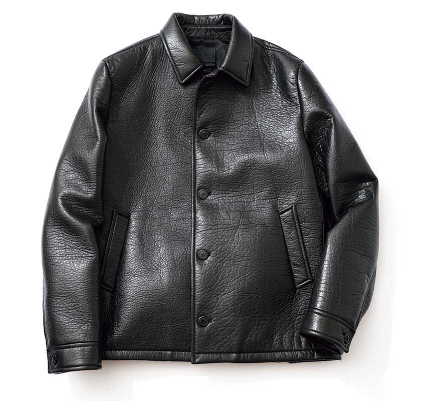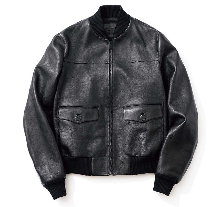 柔らかなレザーをワックス仕上げした深みある表情にリッチさが滲むボンバージャケット。背面にはレザーのトライアングルロゴをあしらい、さりげなくバックシャン。予定価格79万2000円(プラダ/プラダ クライアントサービス)