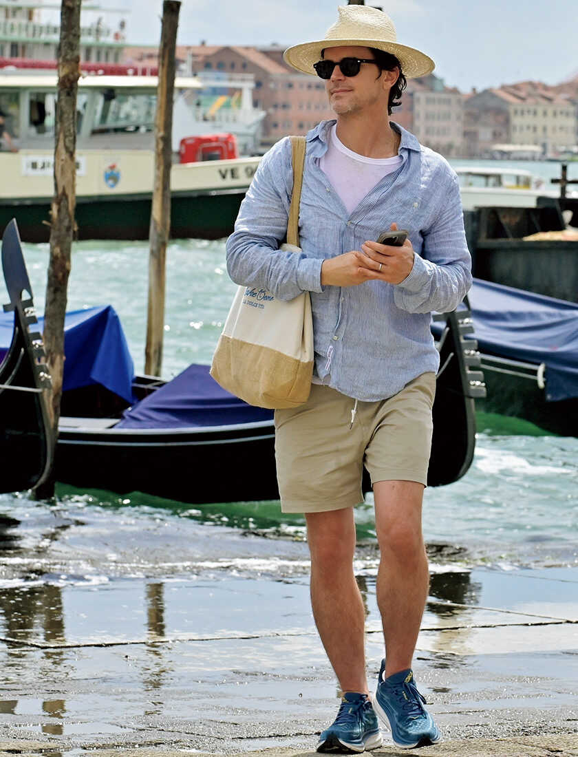 [マット・ボマー]Matt Bomerリゾートライクな格好で海辺を行く俳優マット。でも足元はまさかの〈ホカ〉“クリフトン9”。