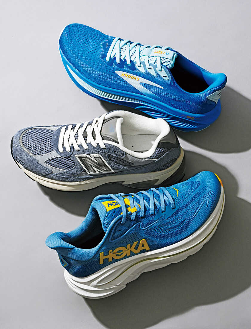 上:人気の高機能ランシューシリーズ最新作“ゴースト17”。前作に比べ、ソールを厚くし、つま先と踵の高低差を10㎜に設定。よりスムースな足運びへとアップデイト。1万8700円(ブルックス/アキレスお客様相談室) 中:2000年代スタイルにブランドのシグネチャー“990”系のエッセンスを加えた“U2010”。ヌバック×メッシュアッパーをデニム風カラーで飾った。2万2000円(ニューバランス/ニューバランスジャパンお客様相談室) 下:その快適さから街履きする人も多い人気シリーズの最新版“クリフトン10”。踵のホールド力を高め、足裏の蹴り出しをよりスムースになるよう設計したことで、安定感を高めた。1万9800円(ホカ/デッカーズジャパン)