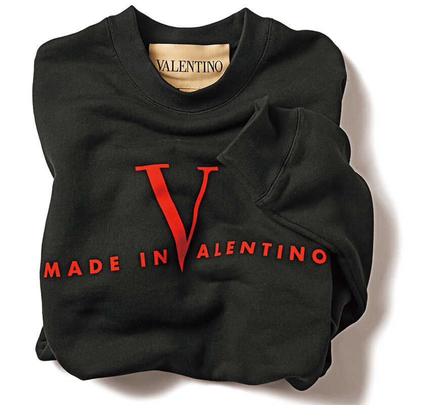 “MADE IN VALENTINO”と大きく描かれたロゴ入りスウェットシャツ。黒ボディに映える赤色のロゴをまとうだけで気分が上がるのはもちろん、大人の余裕や遊び心まで語ってくれる。13万2000円(ヴァレンティノ/ヴァレンティノ インフォメーションデスク)