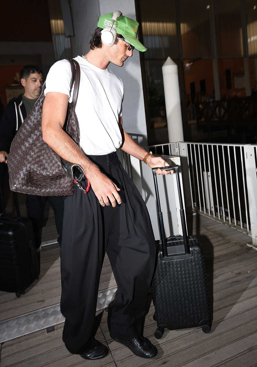 ブランドアンバサダーでもあり、以前から〈ボッテガ・ヴェネタ〉のバッグを持っている姿もよくキャッチされていたジェイコブ。今回、ベネチア国際映画祭に参加するために現れた空港では、トロリーも同ブランドで統一していて、お気に入りブランドであることに間違いなし。黒トロリー&モノトーンウエアにバッグや顔まわりの小物で色を足しているのがうまい!