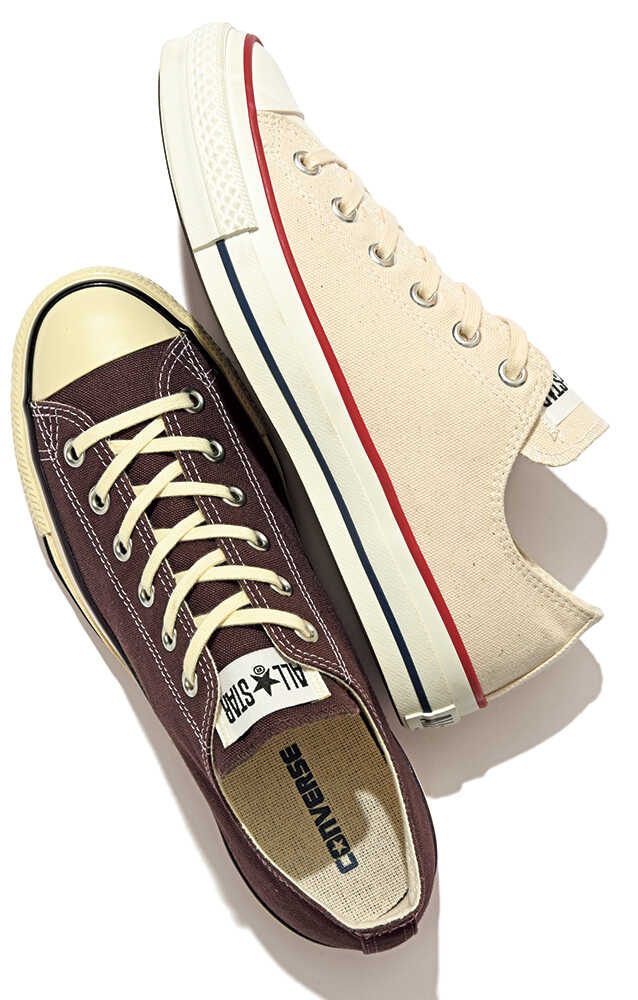 左:洗い加工でこなれ感満点に仕上げた“オールスター エイジド AC OX”。9900円(コンバース/コンバースインフォメーションセンター) 右:日本製“キャンバス オールスターJ OX”。1万4850円 (コンバース/コンバースインフォメーションセンター)