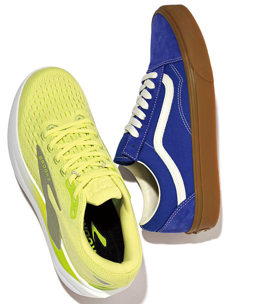 左:ソールの独特なカーブ形状により、スムースな足運びを可能にした“ゴーストマックス 3”。デニムとも相性のいいネオンイエローカラーが、キャラ立ちにも有効。2万2000円(ブルックス/アキレスお客様相談室) 右:深みあるあざやかなブルーのヌバックアッパーに、ガムカラーソールを組み合わせた“オールドスクール”。サイドストライプの白が際立ち、爽やかさも満点。8800円(ヴァンズ/ヴァンズ ジャパン カスタマーサポート)
