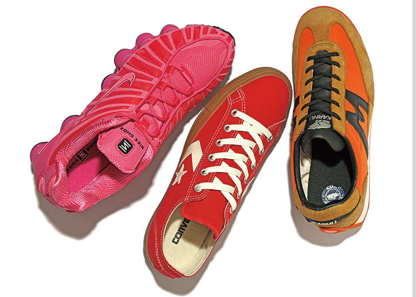 左:円柱型のクッション構造と、シンプルながらモダンなデザインが特徴の“ショックス TLSE 2”。大胆なオールピンクで、まわりの視線も釘づけ! 2万8380円(ナイキ スポーツウェア/ナイキ カスタマーサービス) 中:“シェブロン&スター”が輝く“CRT CLOX”。レトロな雰囲気のガムソールと深みのある赤いアッパーの対比も美しい。7480円(コンバース/コンバースインフォメーションセンター) 右:1977年から、計100万足以上を売り上げた大定番 “メスタリ”。レトロムード満点のデザインながら、エネルギッシュな印象のオレンジの1足なら個性的なコーデに仕上がる。1万5400円(カルフ/シードコーポレーション)