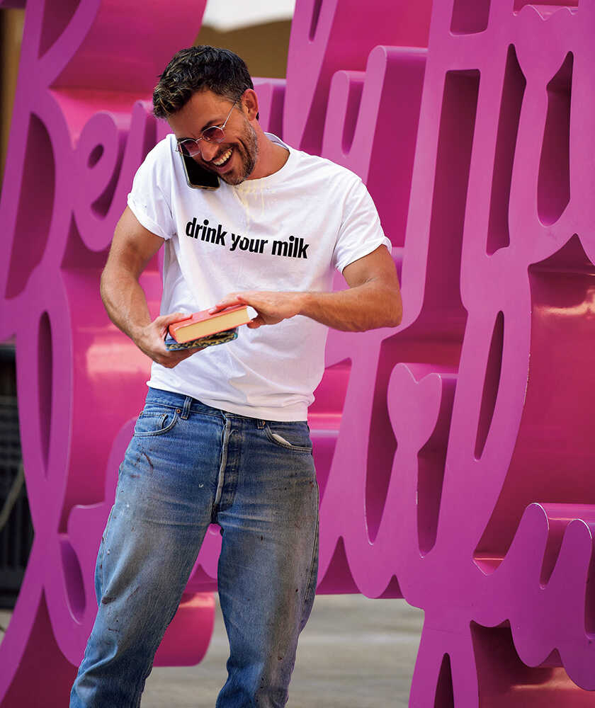 2024年のメットガラに〈ロエベ〉の白スーツで登場したベイリー。LAでパパラッチされたこの日に着ていたTシャツも実は同ブランド。彼が設立した団体“ザ・シェイムレス・ファンド”とのコラボチャリティものだ。どうやら、プライベートではもちろん、チャリティ活動のパートナーとしても〈ロエベ〉と密接な関係を築いている模様!