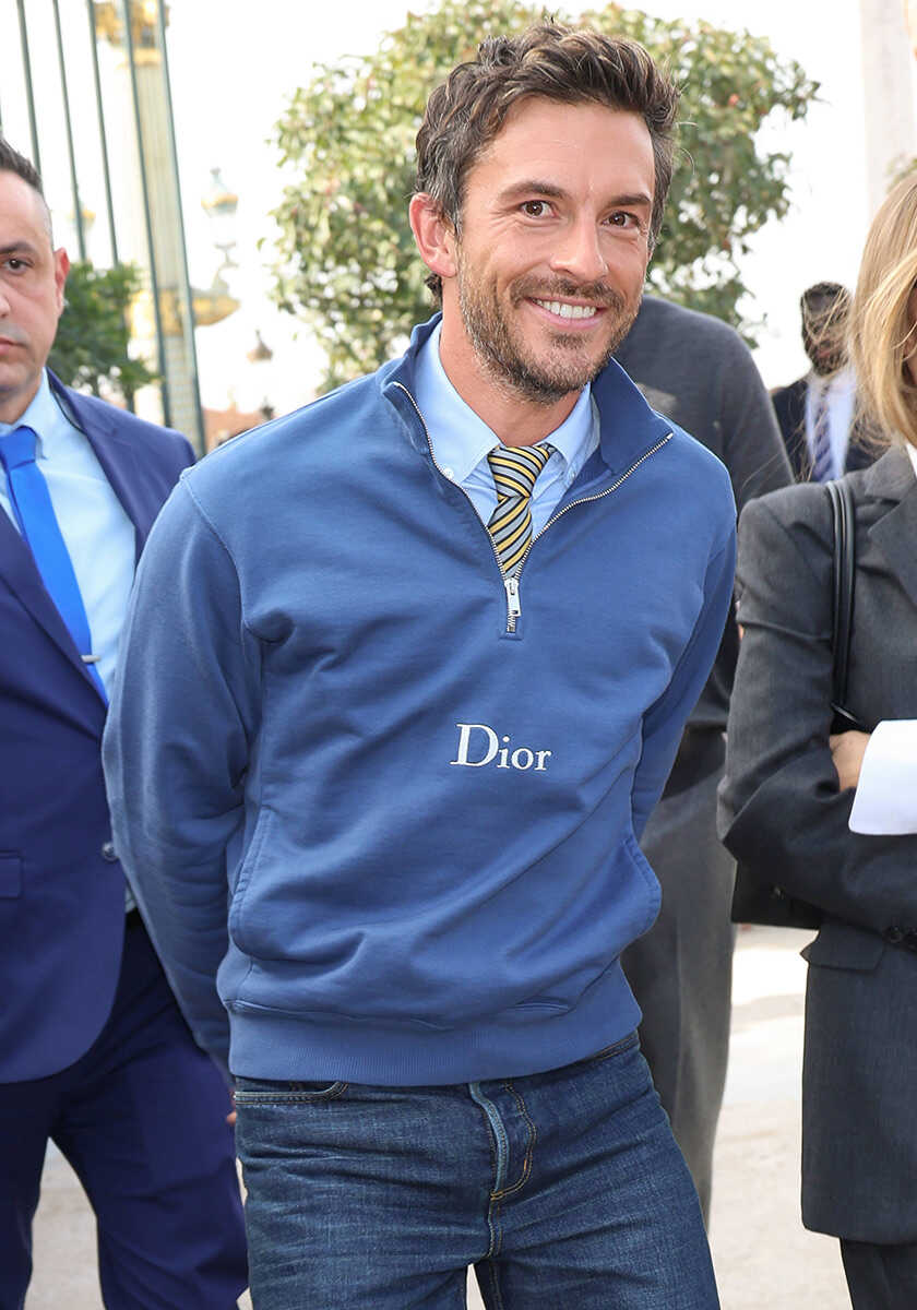 ジェイミーと同じく、パリのファッション・ウィークでキャッチしたジョナサン。スウェットシャツとデニムのリラックス感のあるスタイルながら、タイとシャツを差すことで、一気に上品なイメージに。〈ディオール〉のロゴもセレブらしい品格を主張するのに、ひと役買う!