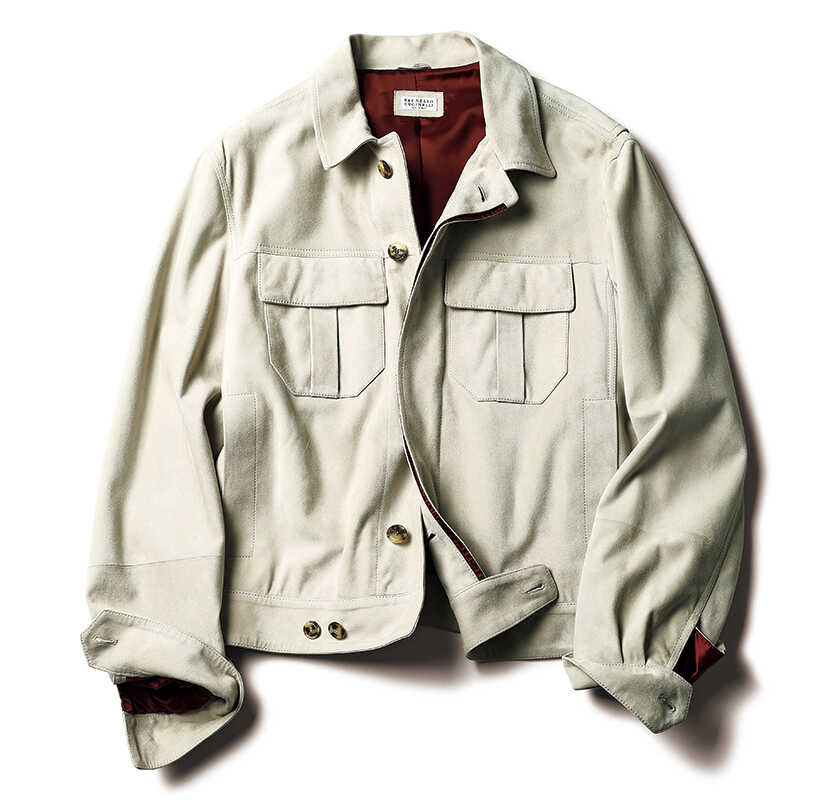 レトロな雰囲気と味を感じさせるスウェード素材の1着。両サイドのフラップポケットに加えて、胸部のジップポケット、内ポケットもふたつ備え、バッグ要らずの収容力。裏地がない仕様なので、スウェードでありながら軽やかで、ロングシーズン着られるのが嬉しい。178万7500円(ブルネロクチネリ/ブルネロ クチネリ ジャパン)