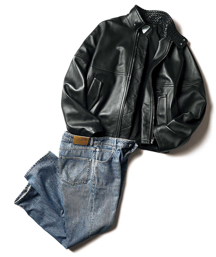 ライダースとミリタリーテイストが薫る“ザ・レザージャケット”な1着。しっかりとした光沢で、武骨かつリッチさを主張。襟裏の“イントレチャート”も大人が選ぶにふさわしいブランド感を伝えてくれる。115万5000円(ボッテガ・ヴェネタ/ボッテガ・ヴェネタ ジャパン)長年穿き込んだようなウォッシュ加工で、潮っぽく仕上がった1本。ベーシックなストレートシルエットで着こなしに取り入れやすく、ジェイコブのように、レザーと合わせるタフなアメカジコーデにもハマる。15万1800円(ボッテガ・ヴェネタ/ボッテガ・ヴェネタ ジャパン)