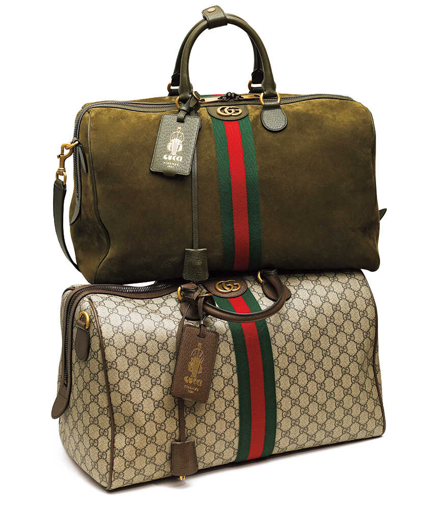 上:スウェードに表革のパイピングやトリムを施し、奥行きのあるデザインに仕上げた “グッチ サヴォイ”。ブランドアイコンの“ウェブストライプ”に加え、“ダブルG”もあしらわれ、贅沢な演出。着脱可能なレザーストラップも付属する。W44×H29×D25㎝。53万9000円(グッチ/グッチ クライアントサービス) 下:上と同じ“グッチ サヴォイ”だが、こちらはコーティングしたキャンバスの“GGパターン”をあしらうことで、ブランド感の主張を強めた。よりラグジュアリーな佇まいとなっている。2ウェイで使えるように、ショルダーストラップ付き。W44×H29×D25㎝。37万4000円(グッチ/グッチ クライアントサービス)