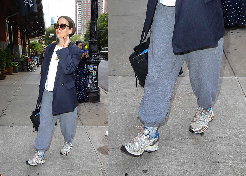 サラはオーバーサイズのストライプジャケットにスウェットパンツを合わせ、ドレスダウンとスポーティを巧みに融合。その足元にこの〈アシックス〉×〈キス〉を取り入れることで、抜け感と個性を両立させたスタイルを完成させている。