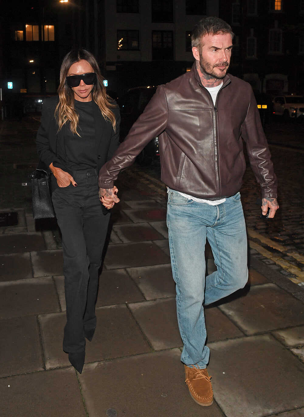 妻ヴィクトリアと連れ立って姿を見せたベッカム。注目したいのは、ブラウンのレザージャケットとブルーデニムの色合わせ。実はこの“茶×青”のコンビネーション、アメカジにおいては王道でありながら、取り入れ方次第でグッと洗練された印象に昇華する鉄板配色。ベッカムは、やや色落ちしたライトブルーのデニムを選ぶことで、重くなりがちなブラウンレザーに軽快さをプラス。これがなんとも絶妙に効いている。
