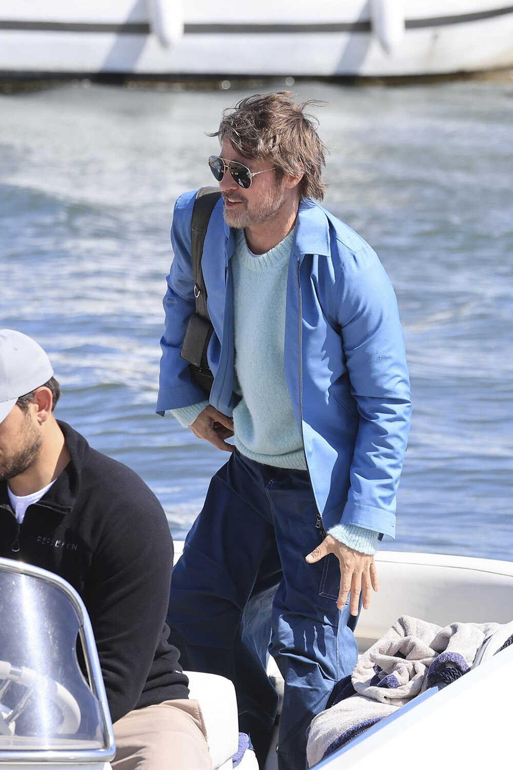この日の装いは、ブルーで統一したワントーンコーデ。ライトブルーの短丈ジャケットに、淡ブルーのニットをレイヤードし、清潔感のある軽やかな印象に仕上げている。ボトムはジャストサイズのデニムパンツを合わせても良いが、太パンツ好きのブラピは紺のカーゴパンツをセレクト。ゆとりのあるシルエットが生むリラックス感と、カーゴ特有の武骨さが加わることで、爽やかさ一辺倒に終わらないたくましさを演出している。