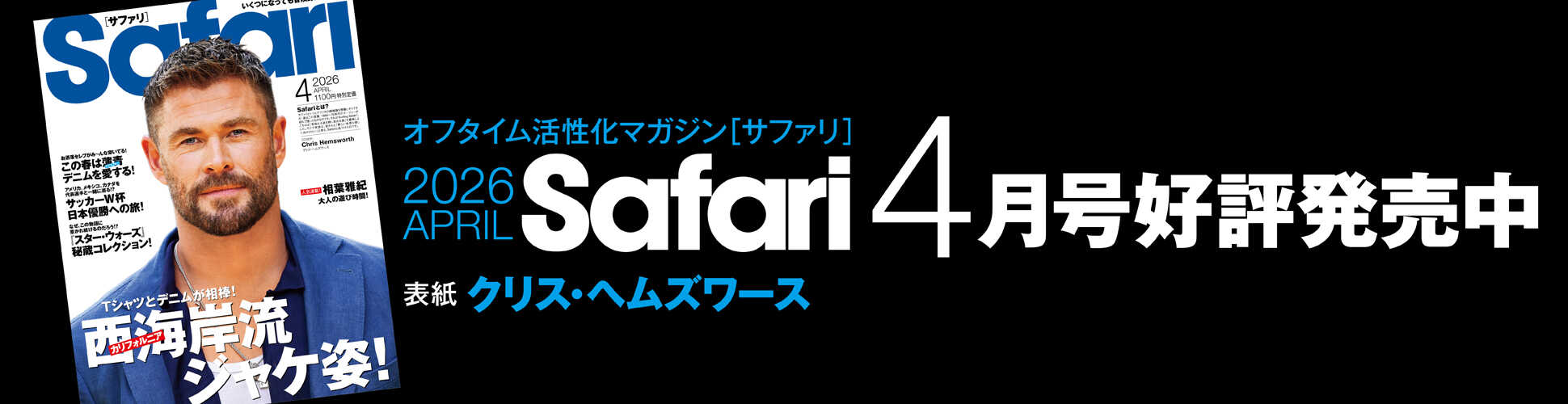 Lifestyle 2026.02.24 NEW 西海岸的なハッピー・ルーム! Gourmet 2026.02.23 NEW アレが食べたいからこの店へ! Celebrity 2026.02.23 NEW セレブのお気に入りブランドの正体! Stay&Travel 2026.02.23 NEW ハートに火をつけて! Denim 2026.02.22 アスリートとデニム Health&Beauty 2026.02.21 Safari BEAUTY 海男のための身だしなみ! Health&Beauty 2026.02.21 Safari BEAUTY 海男のための身だしなみ! Fashion 2026.02.20 Catch the Wave! Culture 2026.02.20 今週末は、この映画に胸アツ! Cars 2026.02.19 話題のクルマを品定め! Gourmet 2026.02.19 はまだふくこの発見! 料理とお酒のベストマッチング! More
